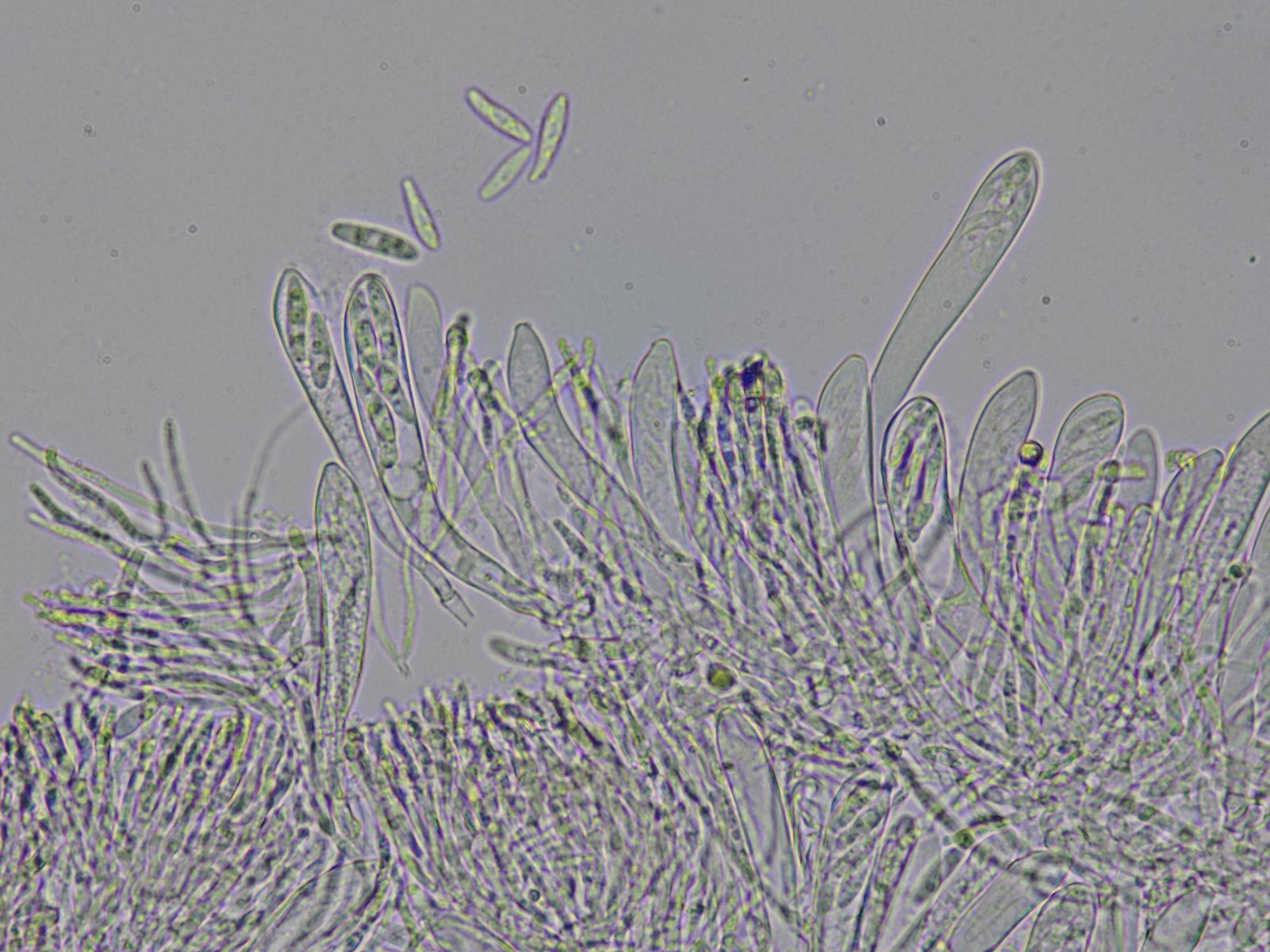 Asci apikal zugespitzt, oft auffällig dezentraler Porus, dieser IKI+ (69.3 - 70.8 × 6.2 - 8.2 µm)
