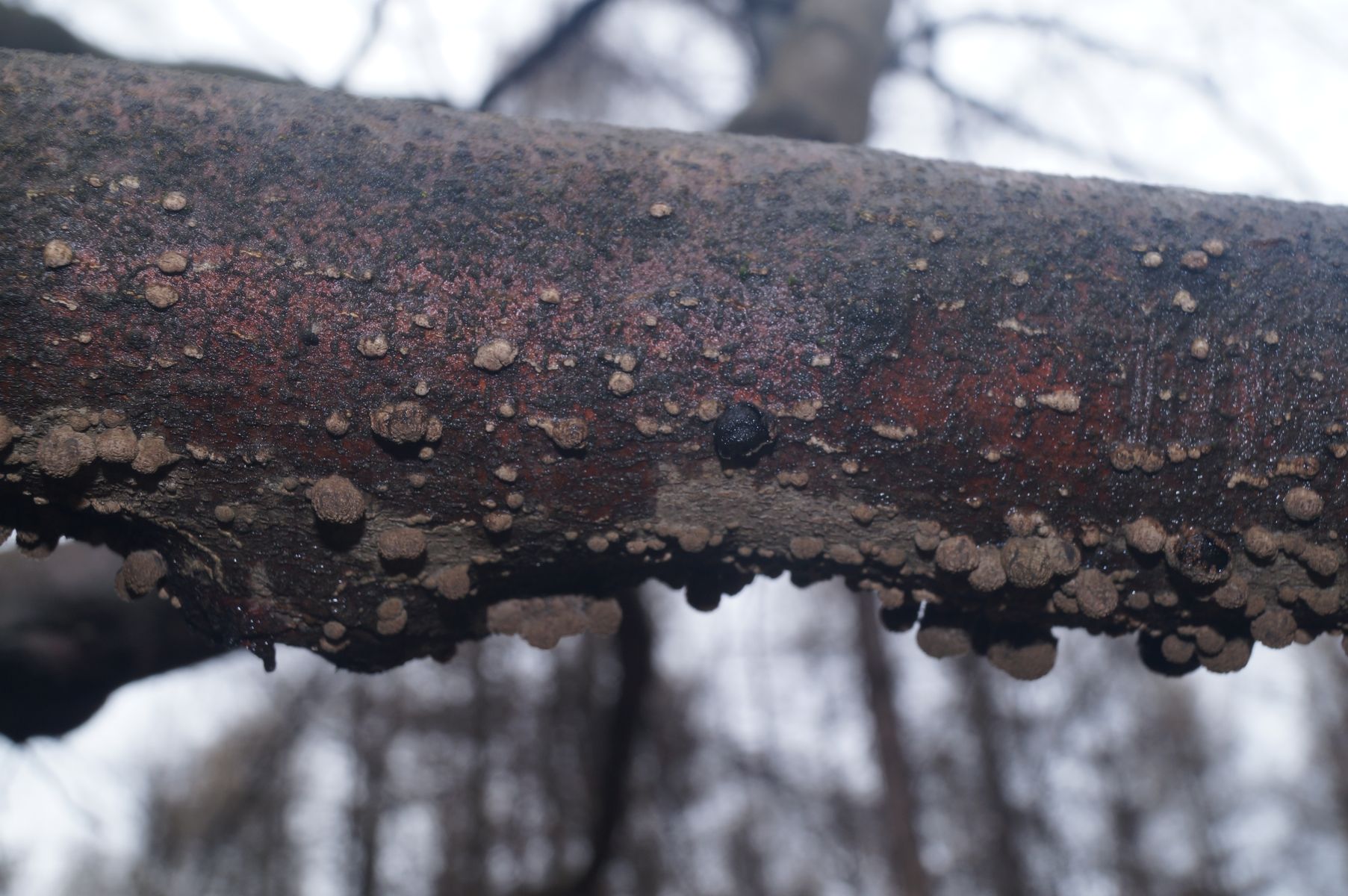 An einem ansitzenden angesengten Buchenast eine überständige Daldinia. Toffel hatte die auf der Exkursion letztes Jahr bestimmt und den Namen genannt, hab ihn leider wieder vergessen.