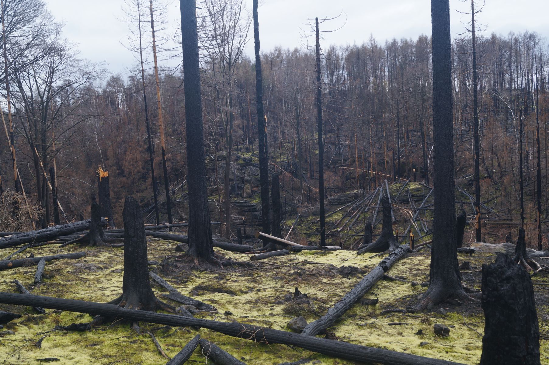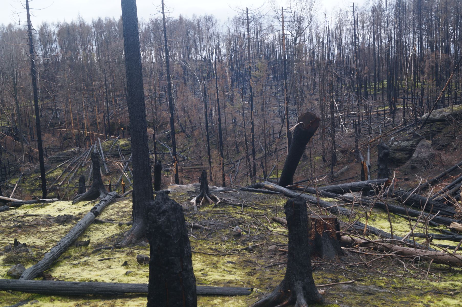 nach den großen Waldbränden letztes Jahr wurde die Fachgruppe Mykologie Dresden vom Nationalpark für ein Kartierungsprojekt angesprochen. Wir sagten natürlich mit Freuden zu. Wir wurden auch vom Ranger per Auto zu der Brandstelle gefahren, denn zu Fuß wäre das ein ziemlich beschwerlicher und langer Anmarsch gewesen.