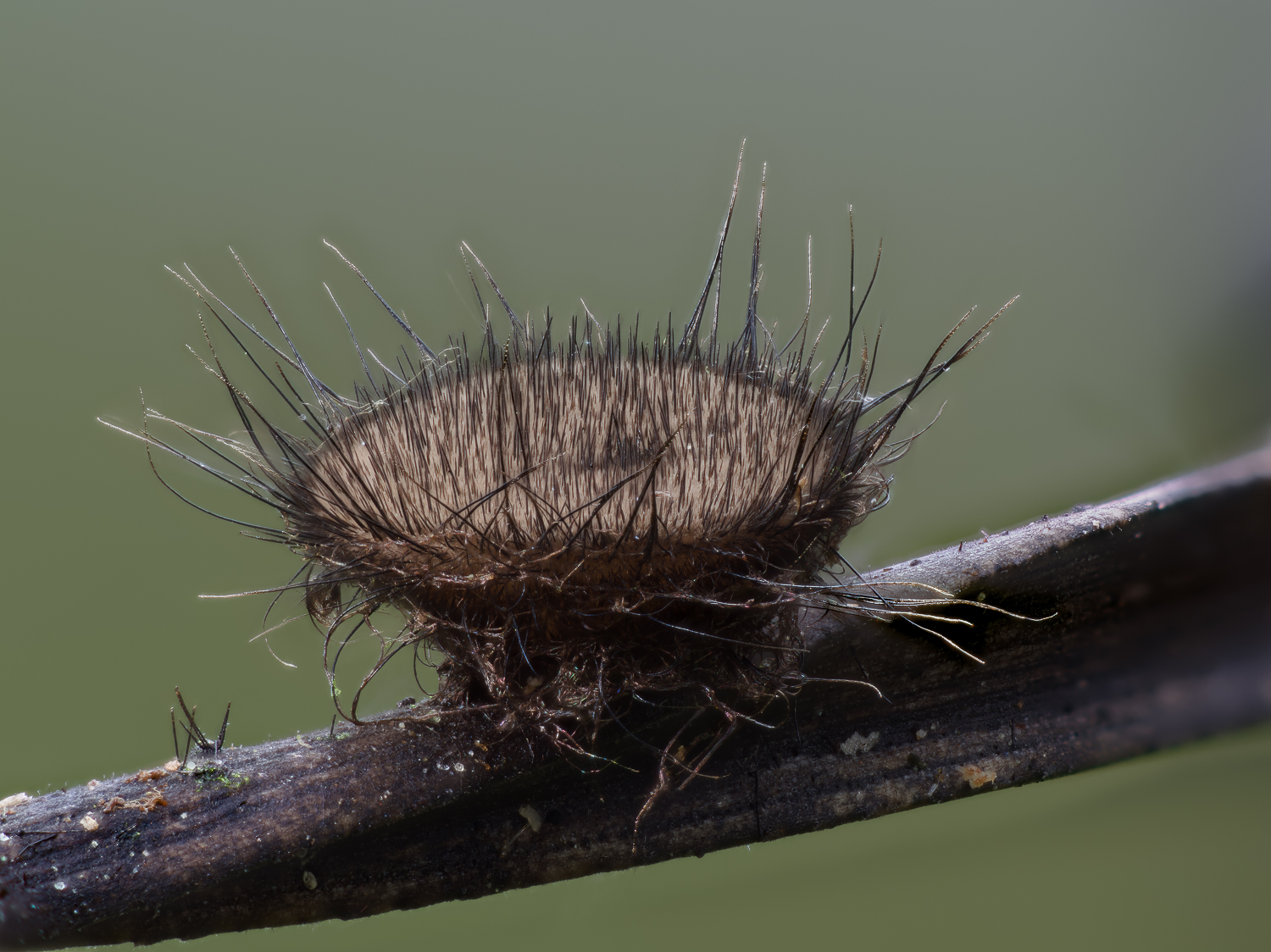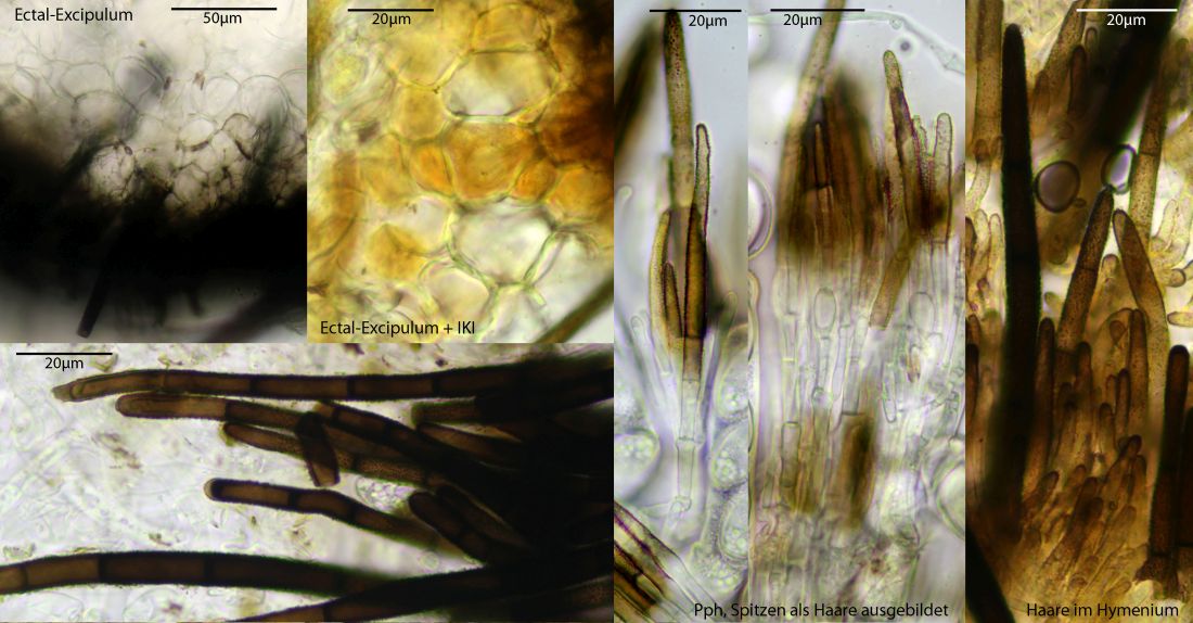 Paraphysen, deren Spitzen als helle, warzige Haare aus dem Hymenium ragen, dazu riesige dunkelbraune Borsten mitten in der Fruchtschicht, die auch makroskopisch erkennbar sind. Noch fetter sind die Randhaare. Die Asci sind sehr lang und an der Basis oft Y-förmig gegabelt. Die Sporen haben eine dicke Gelhülle mit je einer Verdickung an den Polen, bei etwas Druck auf das Präparat löst sich die Hülle unregelmäßig ab. Reife Sporen haben an den Polen jeweils eine Menge Öltröpfchen. Mindestens 4 Zellkerne sind vorhanden, das Anfärben in Karminessigsäre klappte hier noch nicht optimal sicher auch weil durch die Sporeninhalte eventuelle Kerne nahe der Pole kaum erkennbar sind.