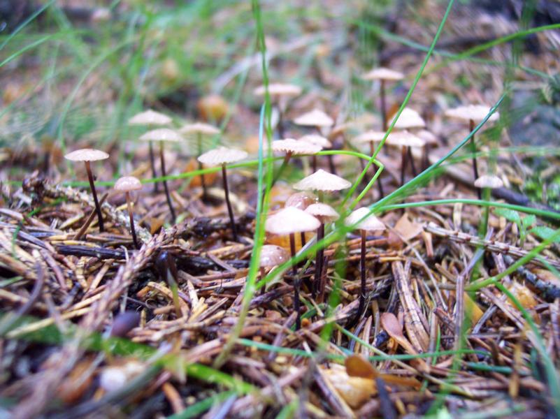 Und das ein Nadelschwindling (Micromphale perforans). Die Beschreibung "rasiges Wachstum auf Nadeln" passt gut.Am Geruch lässt er sich unzweifelhaft erkennen! Vorher zerreiben..