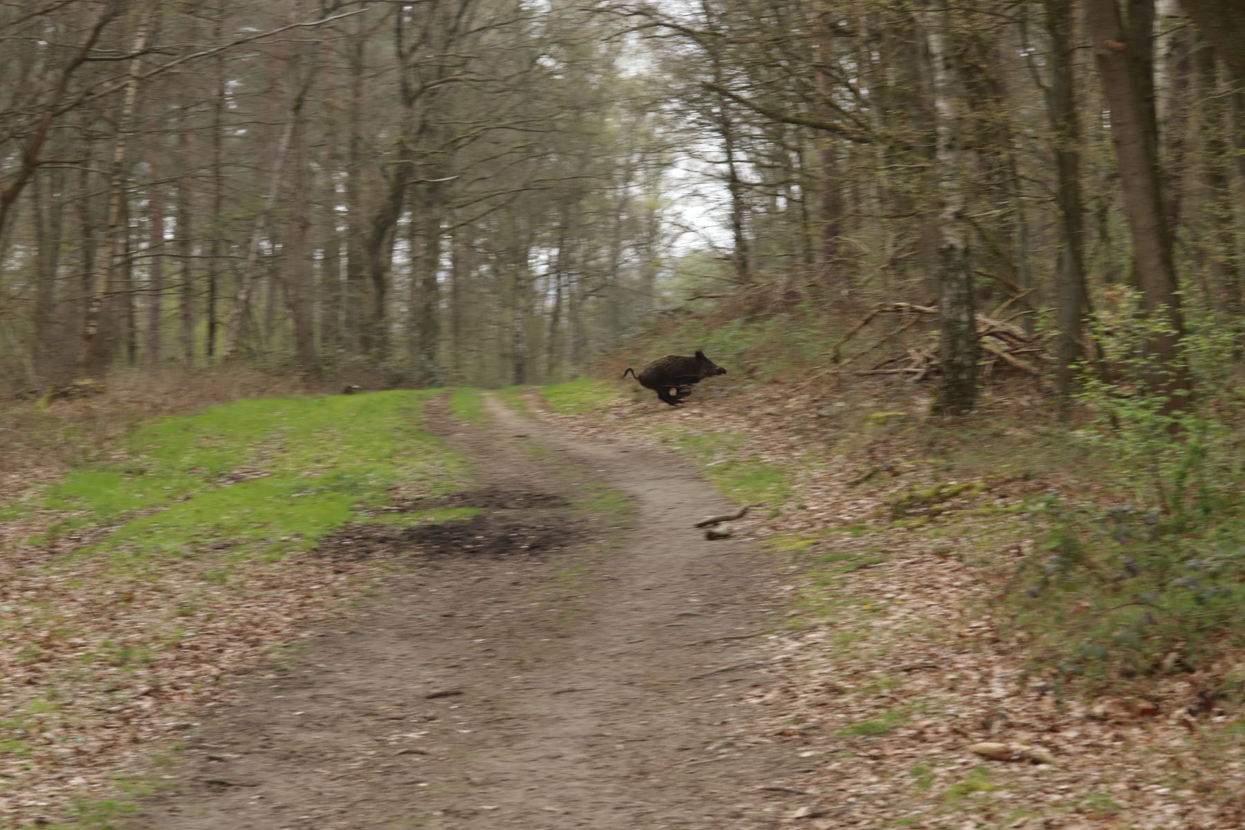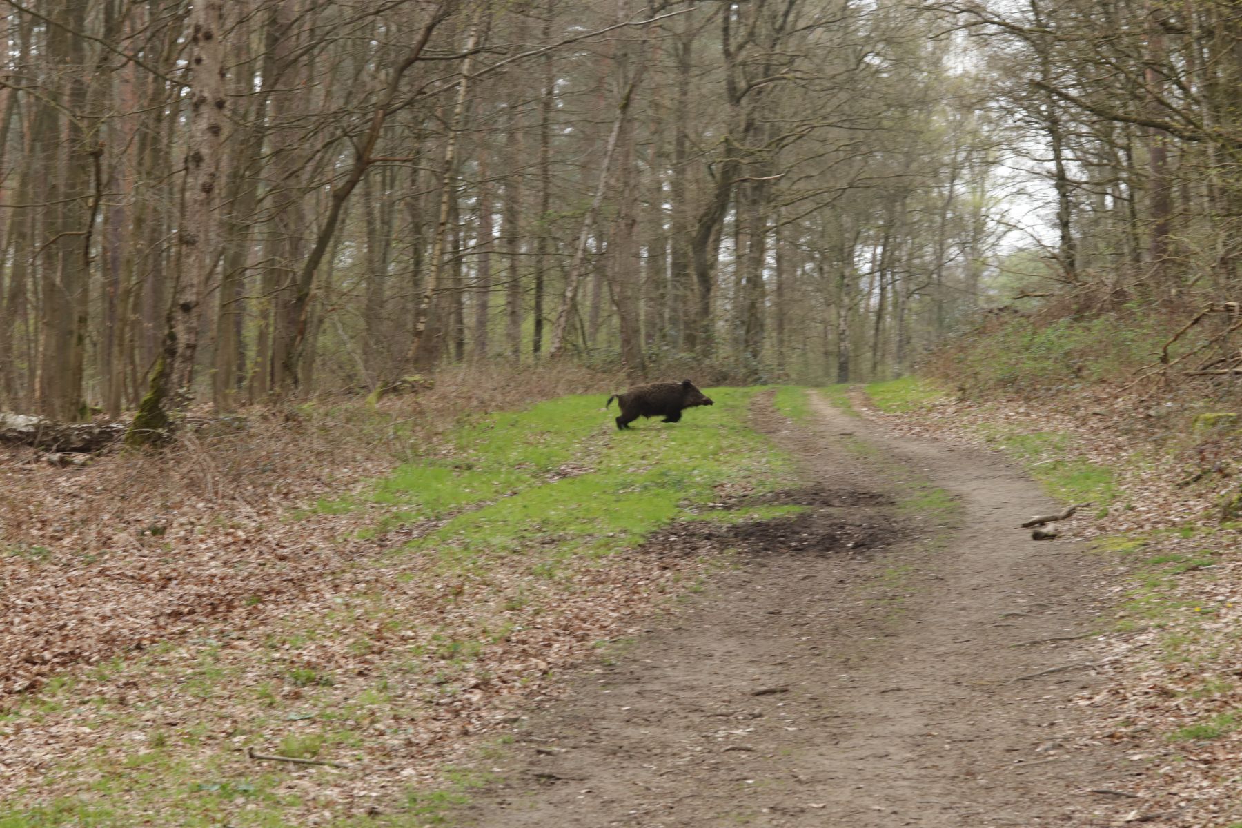 8. Kurz vor Ende der Tour bemerkt ich dann ca. 30 m vor mir links im Wald ein großes Tier, das eilig Richtung Weg lief. Mein erster Gedanke war: Welcher Idiot läßt denn hier seinen Hund frei durch den Wald rennen - und das noch im Frühling? Als das Tier dann auf den Weg kam, stellte ich fest, daß der für Hunde typische Kopf oberhalb des Körpers fehlte und es sich stattdessen um ein Wildschwein handelte. Zum Glück kam direkt dahinter noch ein zweites Exemplare des Weges und ich konnte zwei Fotos schießen.