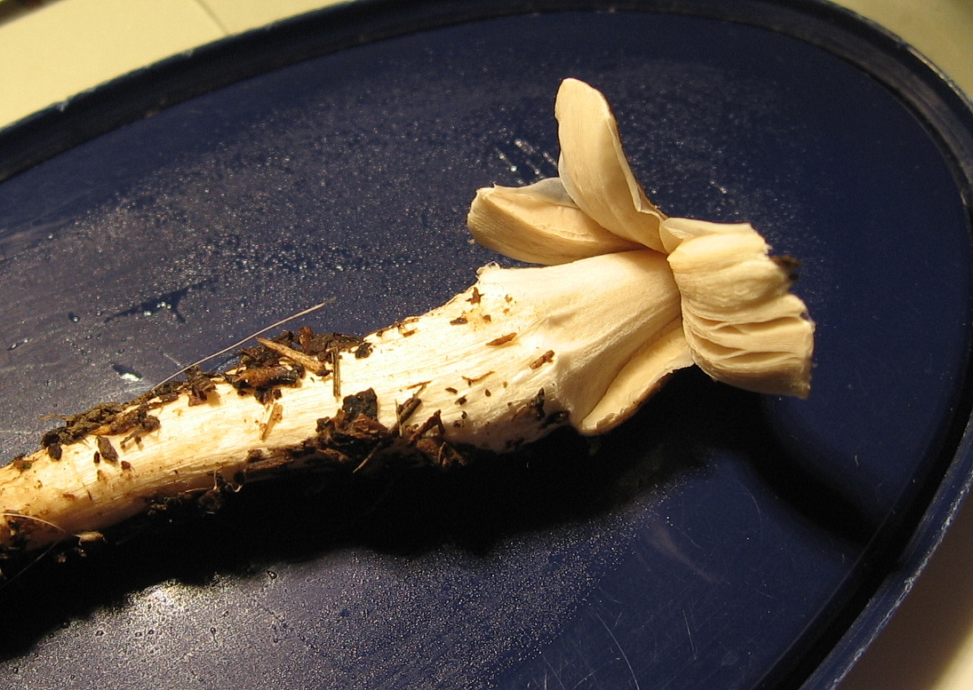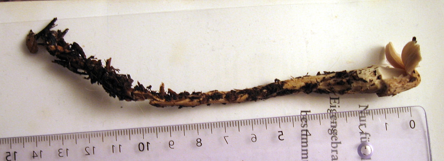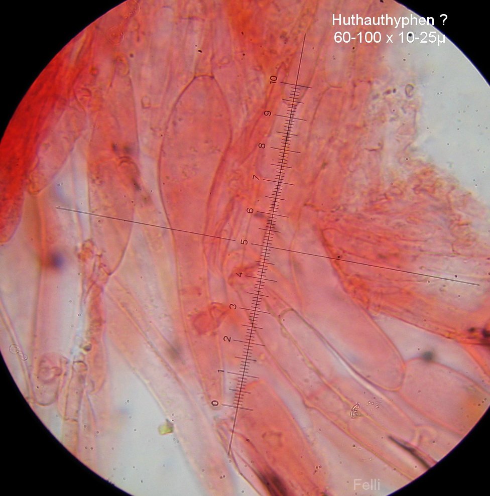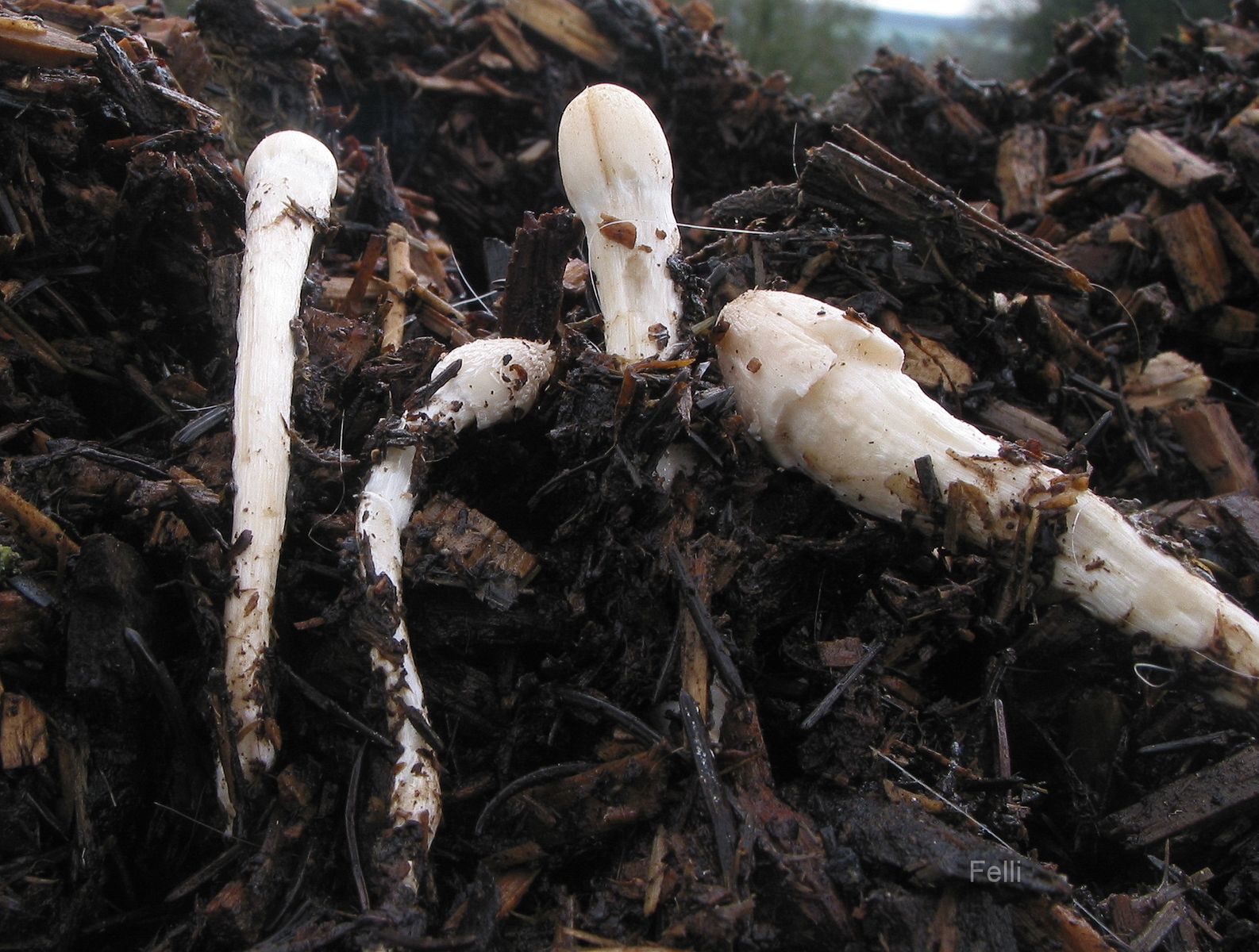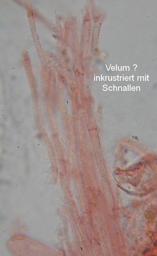 der Pilz hat einen kleinen helmartigen Hut ca. 1cm lang mit Velumresten und einen wurzelnden Stiel bis 15 cm.