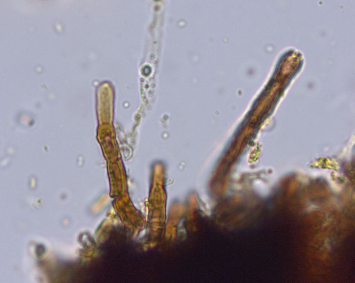 | Sämtliche Bestimmungsversuche meinerseits im Moment erfolglos: Auffällig sind die relativ kleinen gelb-grünlichen erscheinenden Sporen. Ausgeprägt langes Rostrum, Substrat Fagus, corticol, Seten/Haare, braun, septiert, Sporenmasse 5,5 - 6,5 (7) x 2 µm, 1fach septiert, Sporenfarbe grünlich, Sporenform +/- elliptsich, IKI- |