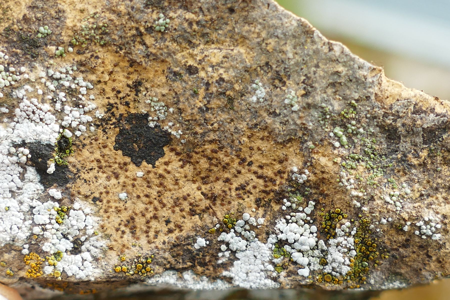 Bild 2 Feiner Standsteinbrocken, zentral mit bräunlichen Apothecien der gesuchten Flechte