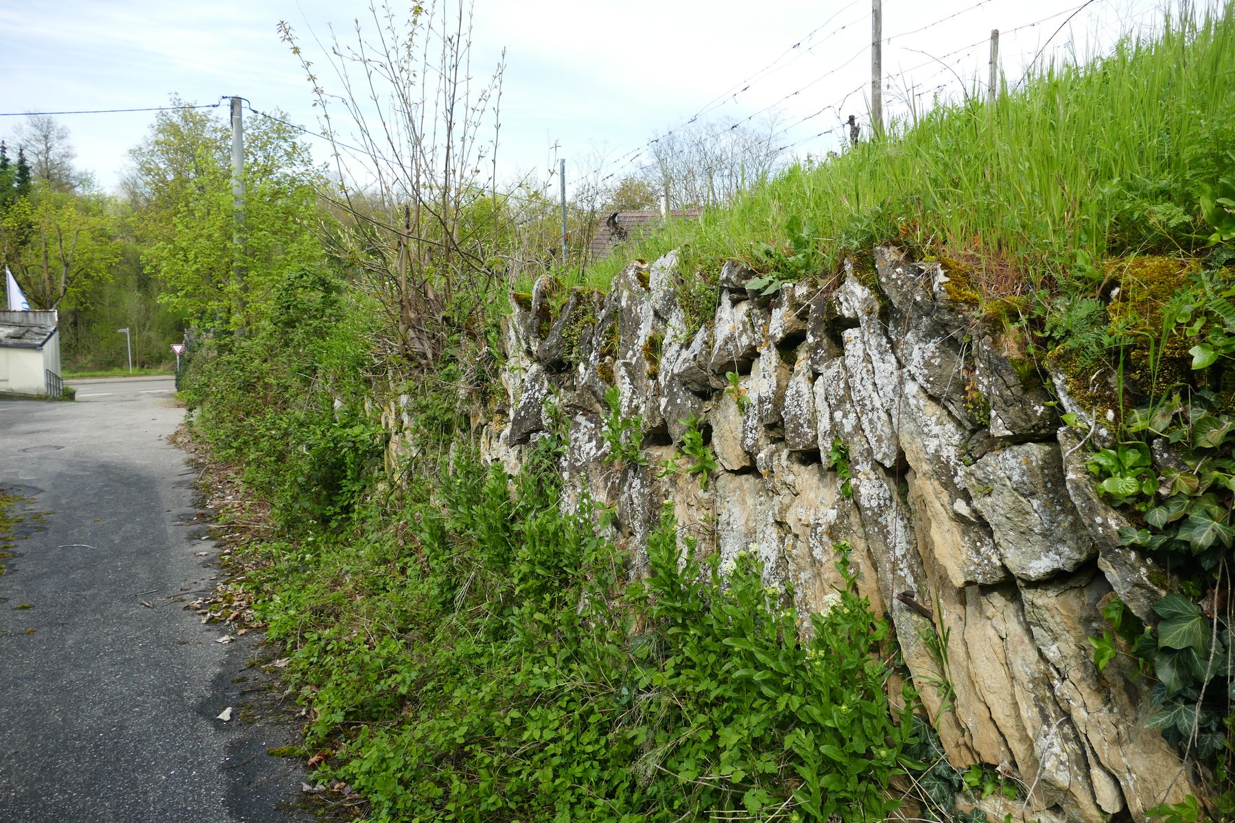 Bild 1 Trockensteinmauer in Südausrichtung, davor Brombeergestrüpp und Moos