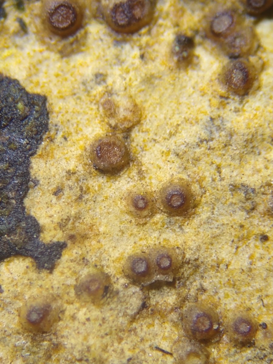 Bild 3 Kraterartige, bräunlich-transparente Areolen mit braunem Excipulum und hellbrauner Scheibe