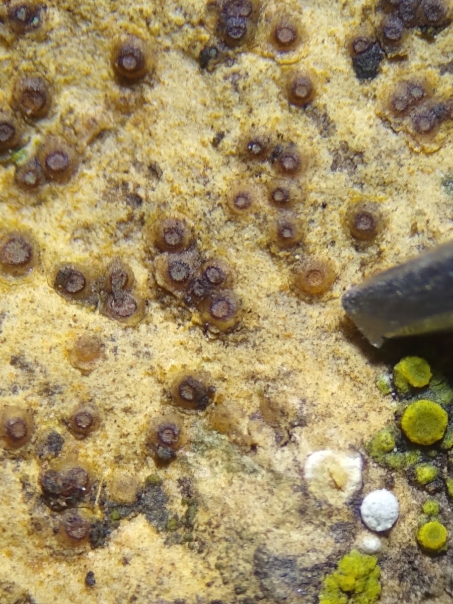 Feucht lassen sich die gummiartig elastischen Areolen leicht mit der Nadel als Ganzes vom Substrat abschieben.