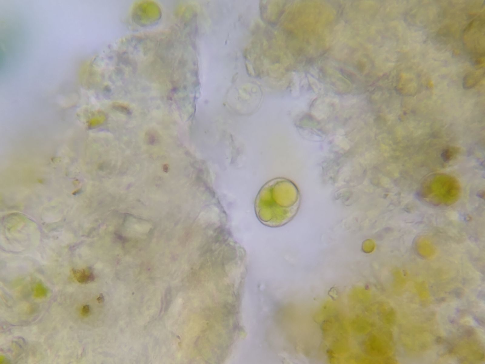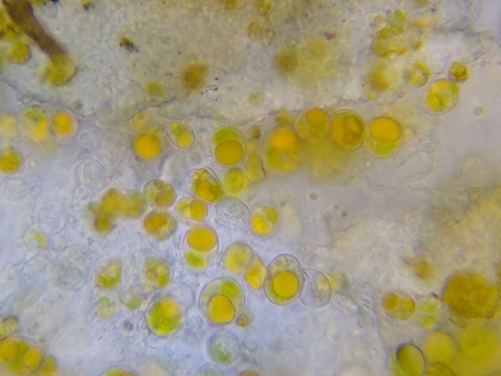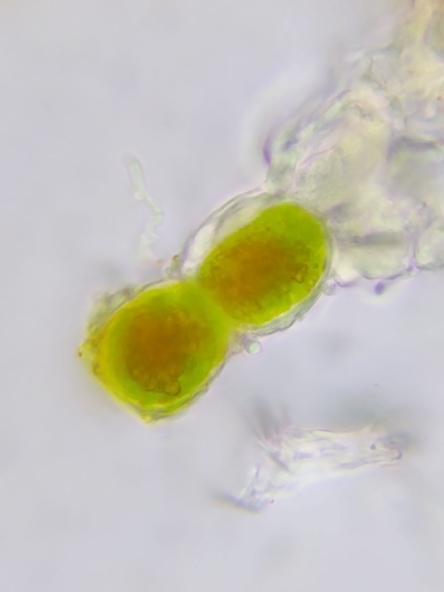 Bild 6 Der coccoide Algenpartner weist riesige gelbe Tropfen auf - Trentepohlia oder nicht - das ist hier die große Frage