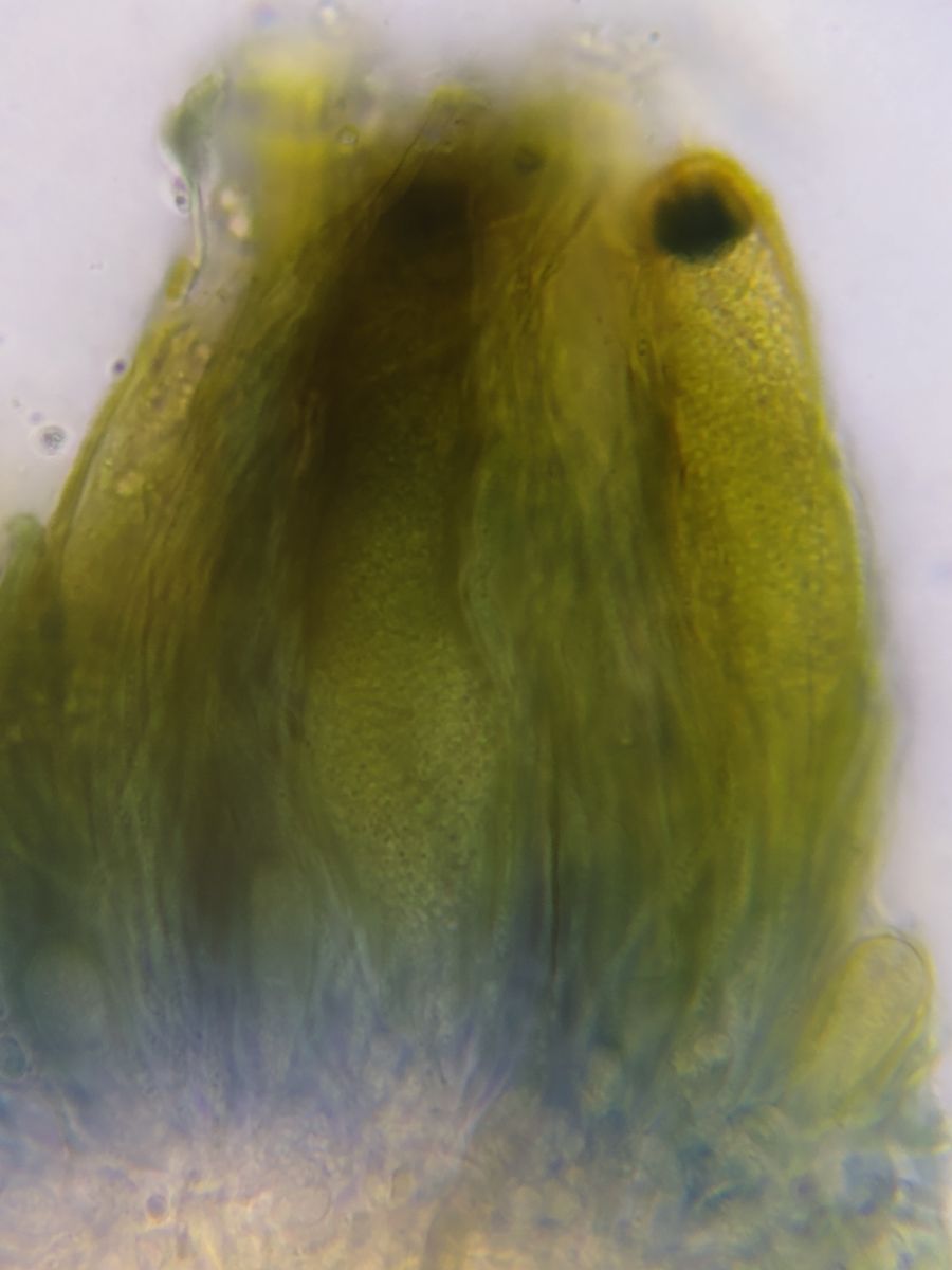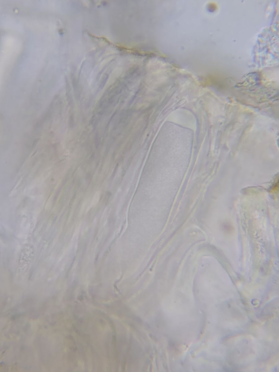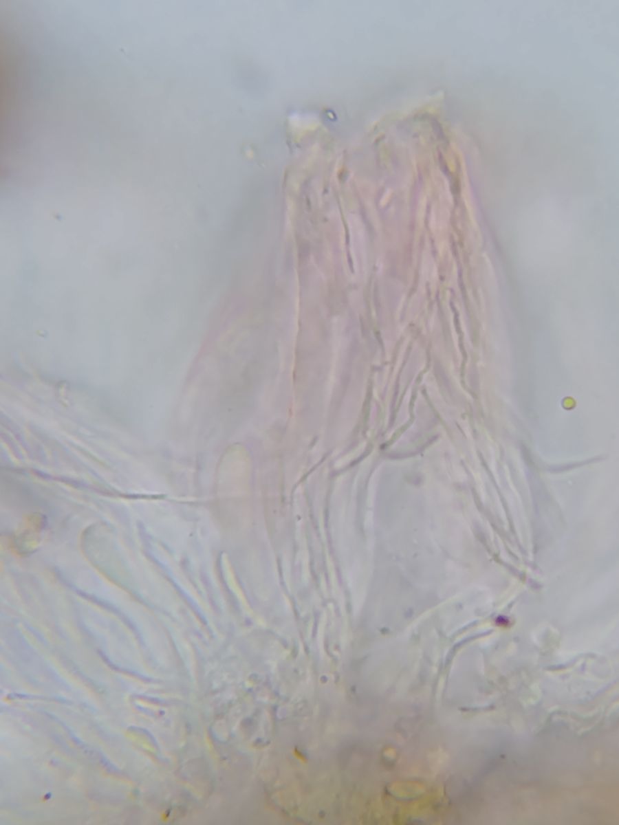 - Hymenium farblos, etwa 90-100µm dick, stark verklebt