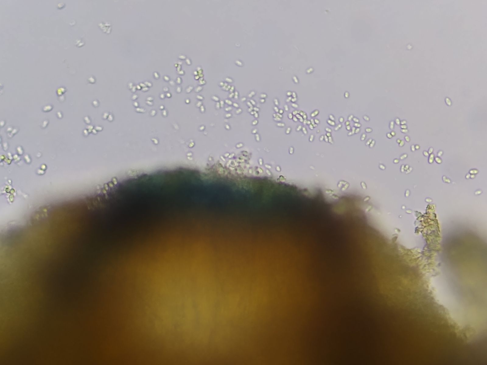 Bild 11 Sporen in Wasser um 5x3 µm groß, breitelliptisch, 2 große Tropfen im Inneren (Hym. hier IKI+, Sporen IKI-)
