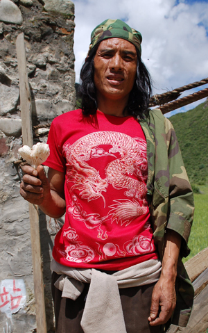 Waehrend meiner Pilzreise durch Osttibet bin ich diesem Pilz in Lithang begegnet und kann ihn nicht recht zuordnen. Er scheint gut essbar zu sein, der Tibeter hatte einen ganze Plastiktuete voll davon fuer den Eigenbedarf. [Der einzig kommerziell gesammelte Pilz in diesem Tal neben Tricholoma matsutake war zu dieser Zeit der Habichtpilz (Sarcodon imbricatus)].