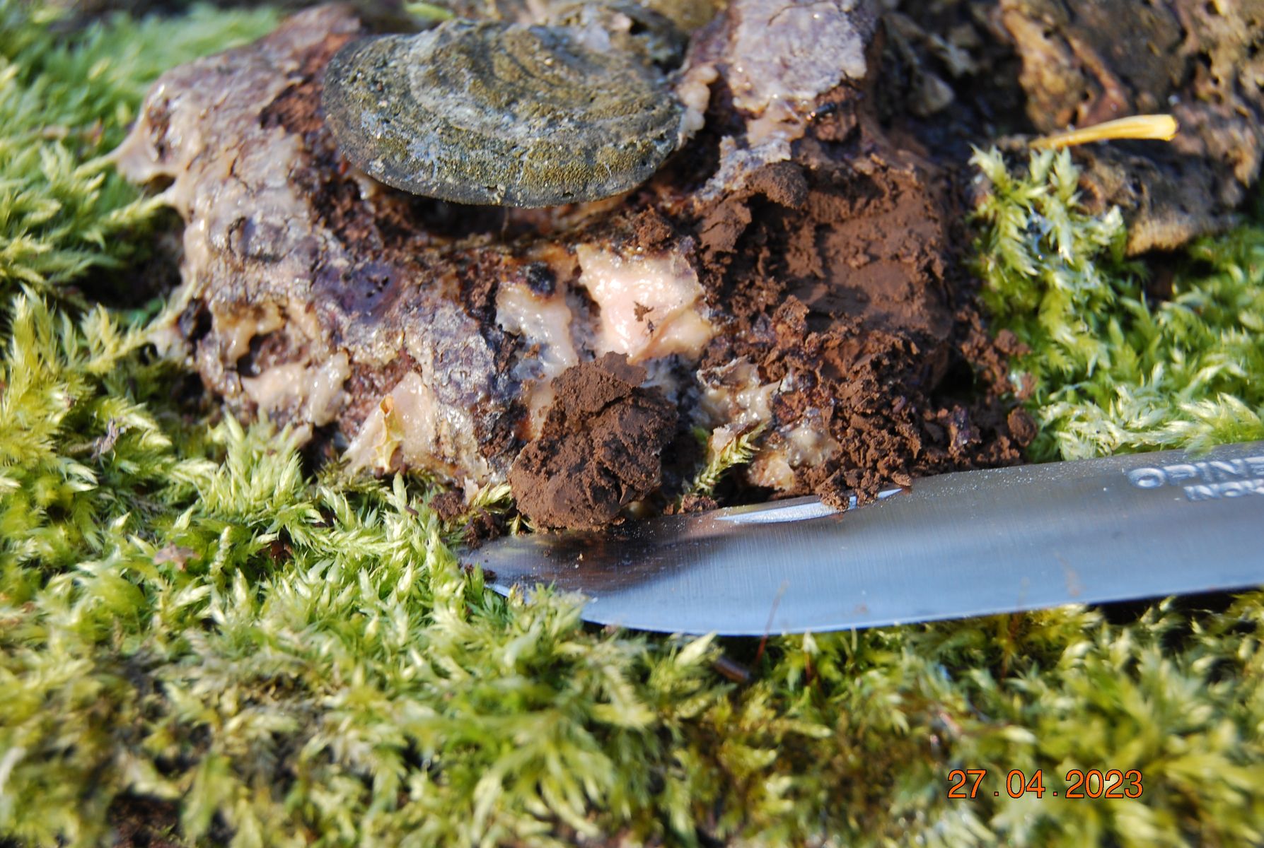 so sieht das Kerlchen dann heute aus: die Schnecken haben da noch ein bissl weiter geknabbert, der Fk. gibt die Sporen schon frei, hab mal an einer Stelle mit meinem Messer reingepiekst u. das Sporenpulver sieht ein bissl wie Kakao aus.