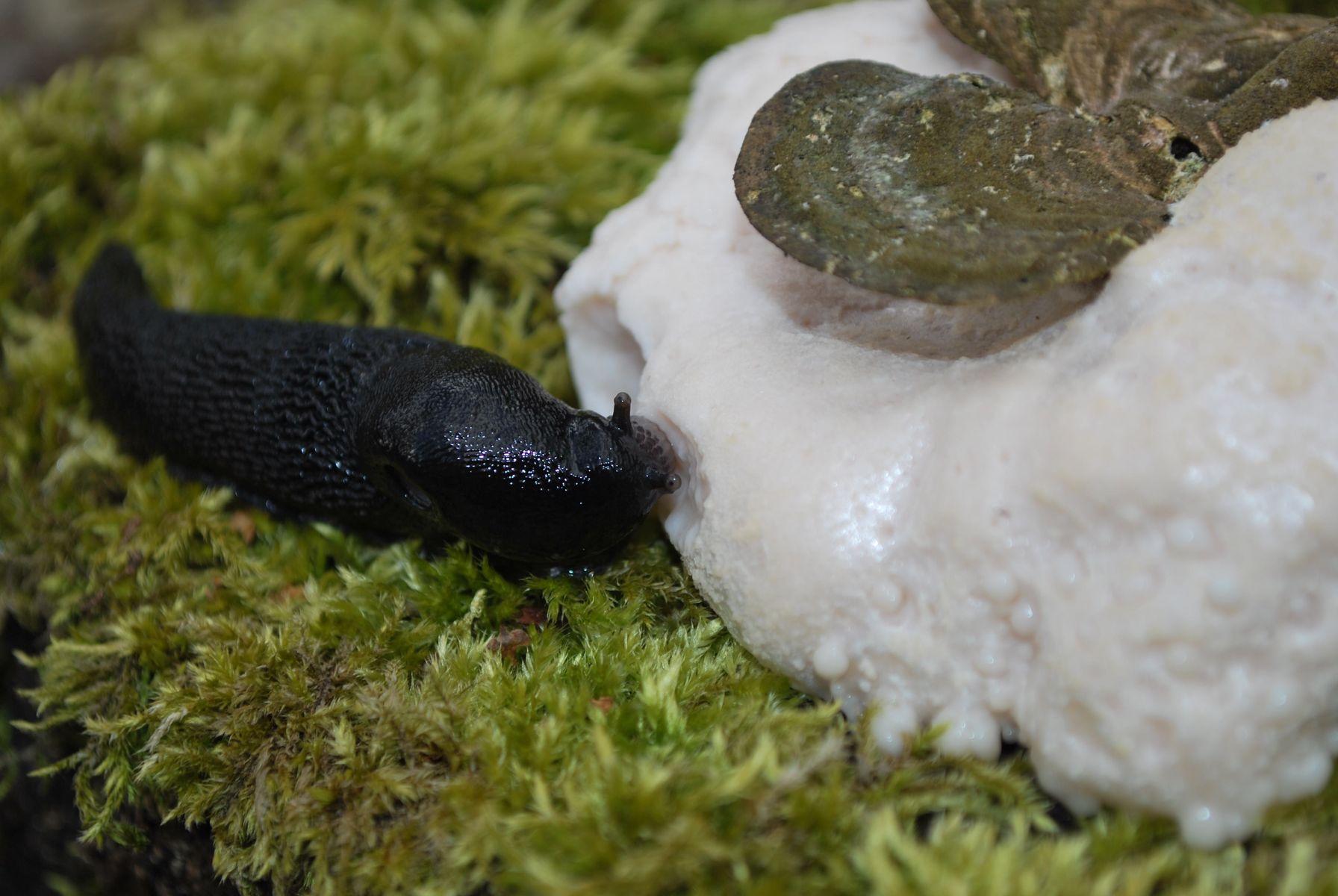 Also, vier Dinge sind für mich hier soweit klar: Ich sehe hier eine Schwarze Wegschnecke (Arion ater), eine Quercus-Stubbe, Moos und Stereum-FK (nicht mehr ganz so frische Exemplare).