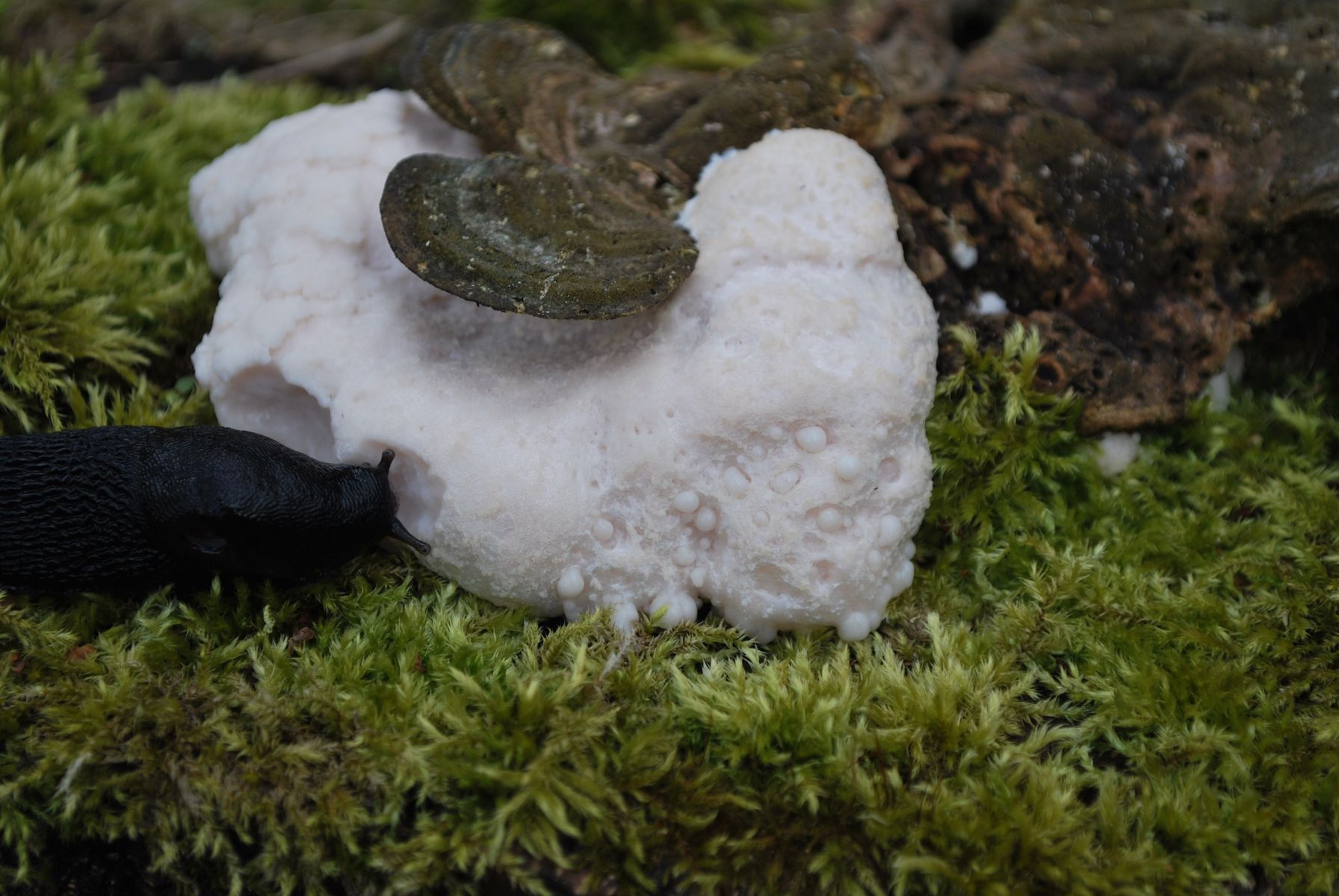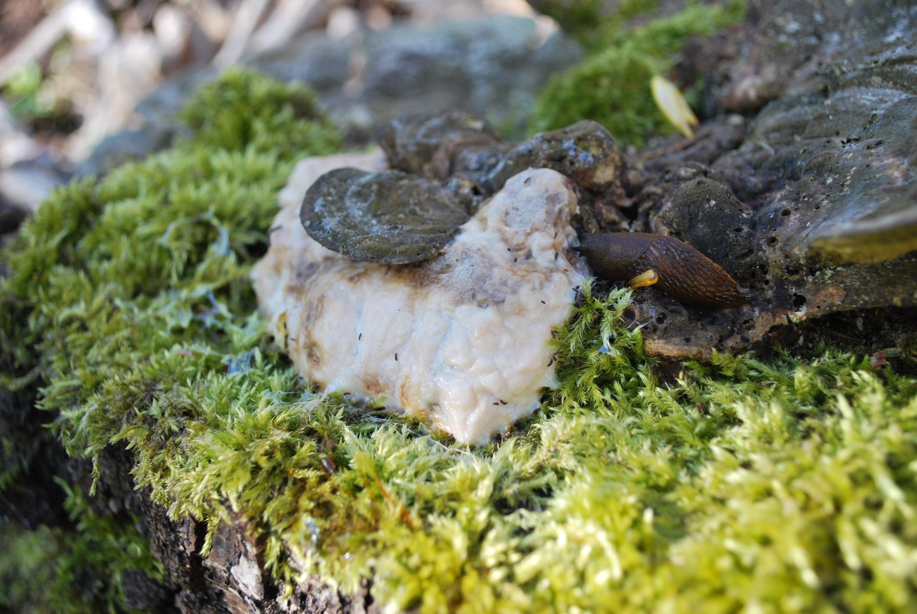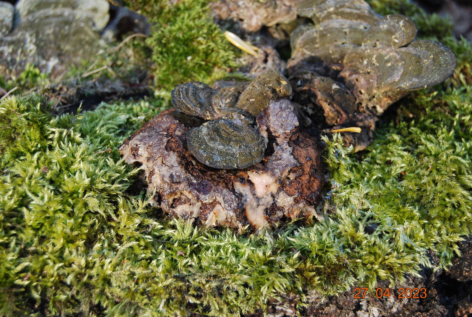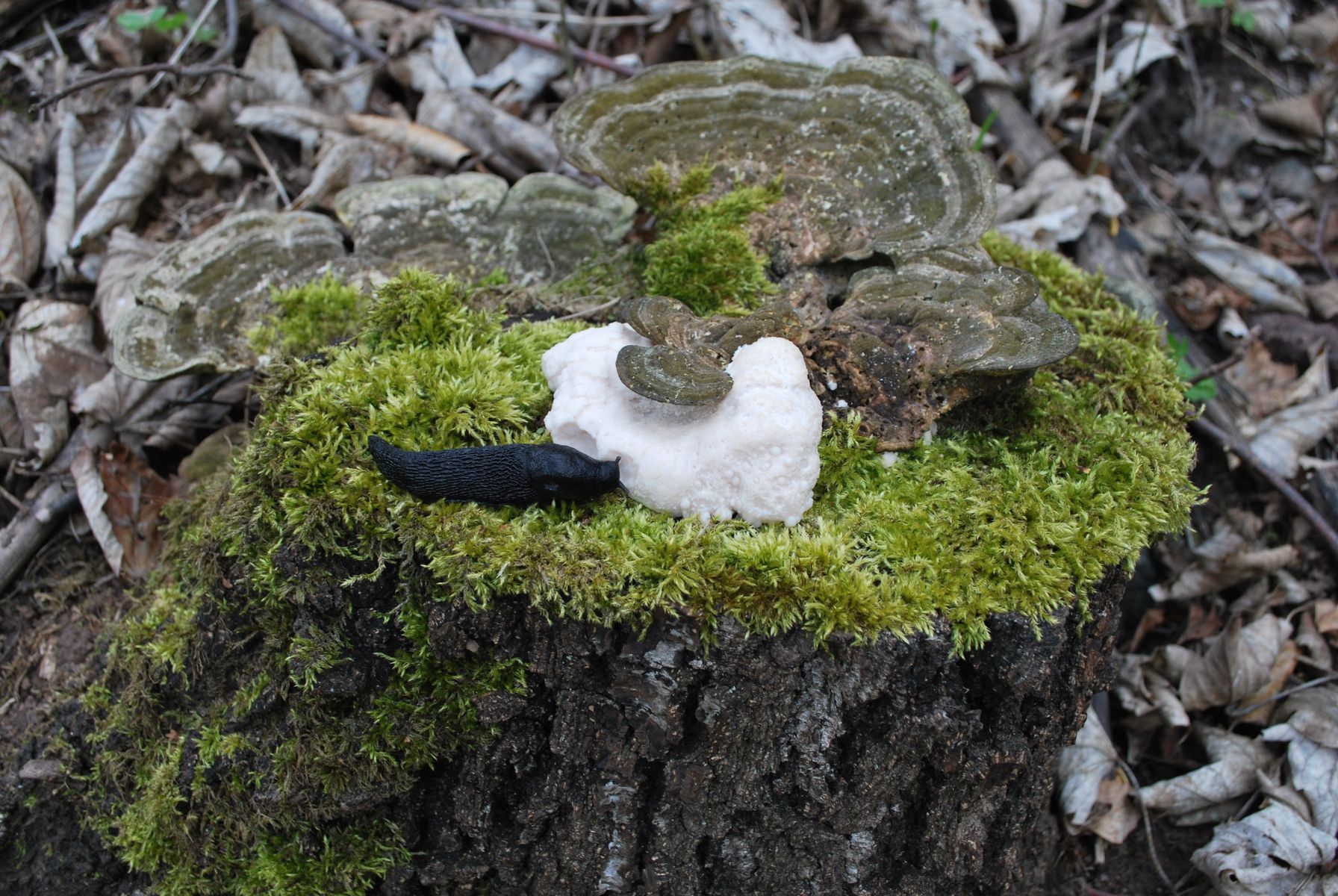 Also, vier Dinge sind für mich hier soweit klar: Ich sehe hier eine Schwarze Wegschnecke (Arion ater), eine Quercus-Stubbe, Moos und Stereum-FK (nicht mehr ganz so frische Exemplare).
