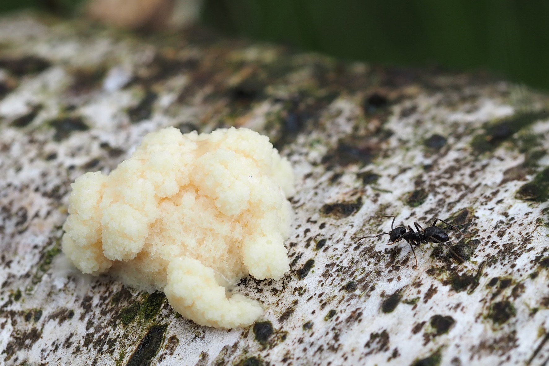 Bild 1: Junger blumenkohlartiger Fruchtkörper mit Ameise