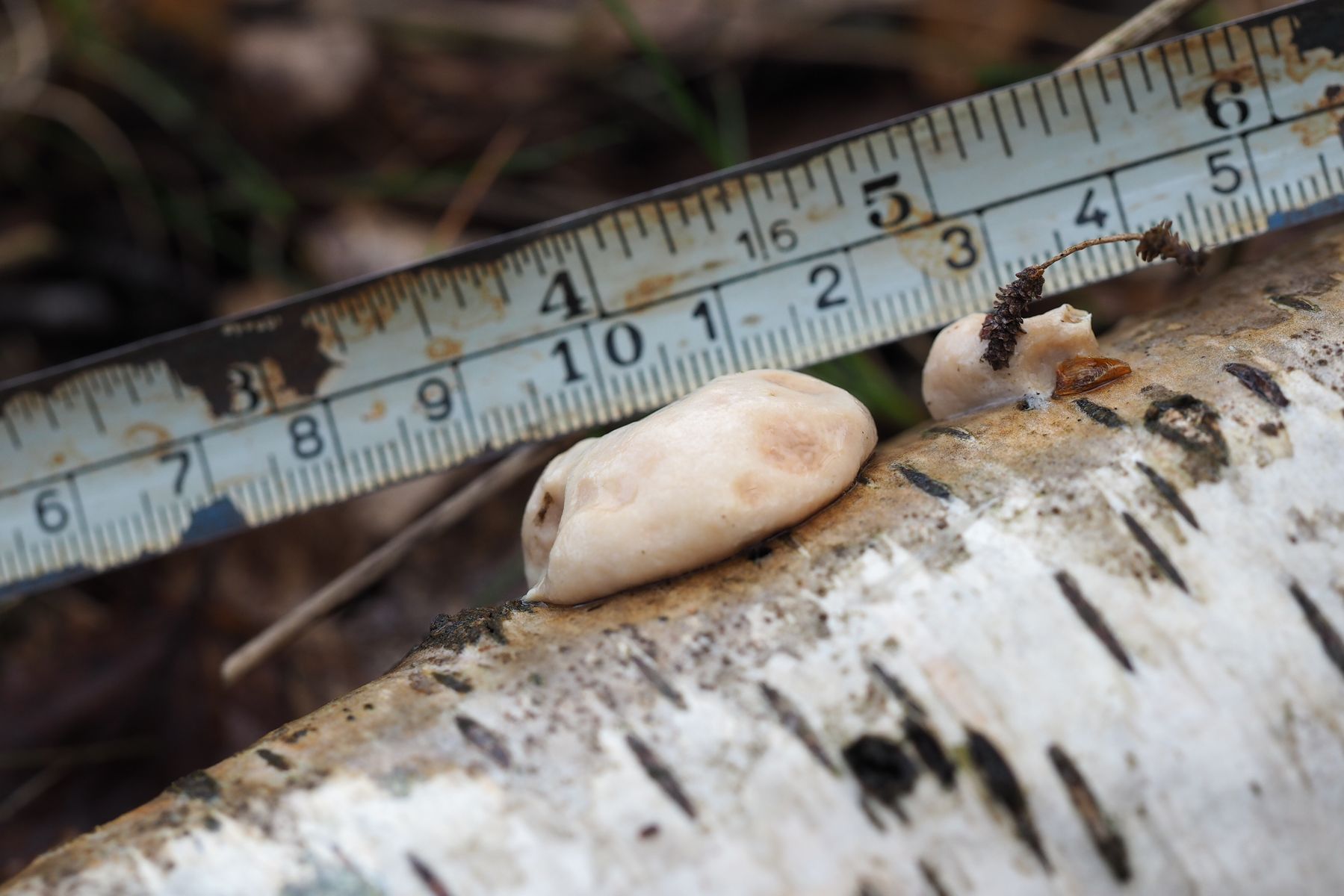 Bild 3: Angefressener Fruchtkörper mit glatter Außenhülle und Maßband