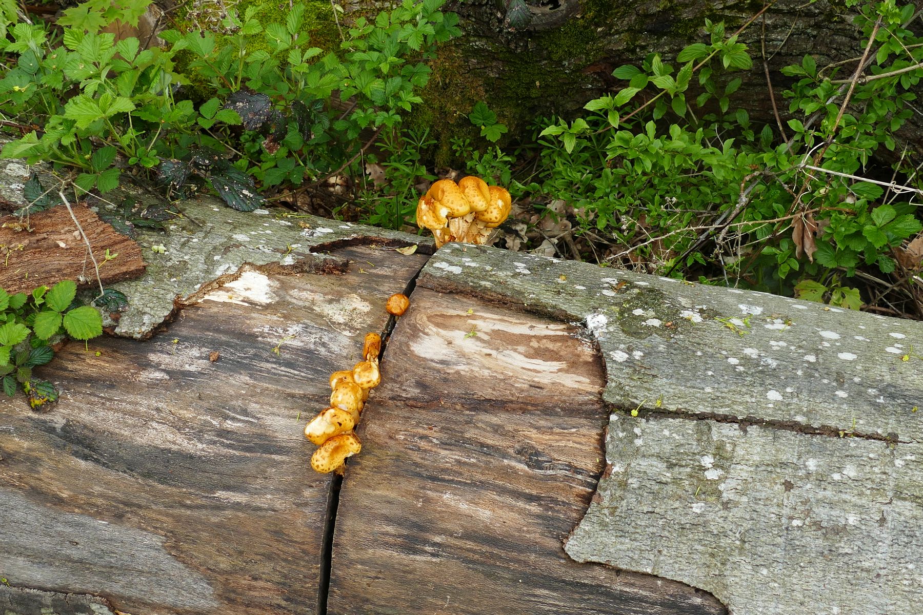 Bild 1 Fundsituation: Leicht deformierte Pilze zwängen sich aus Sägespalt