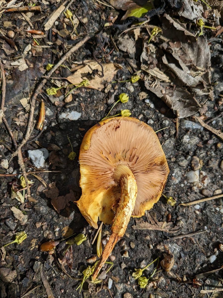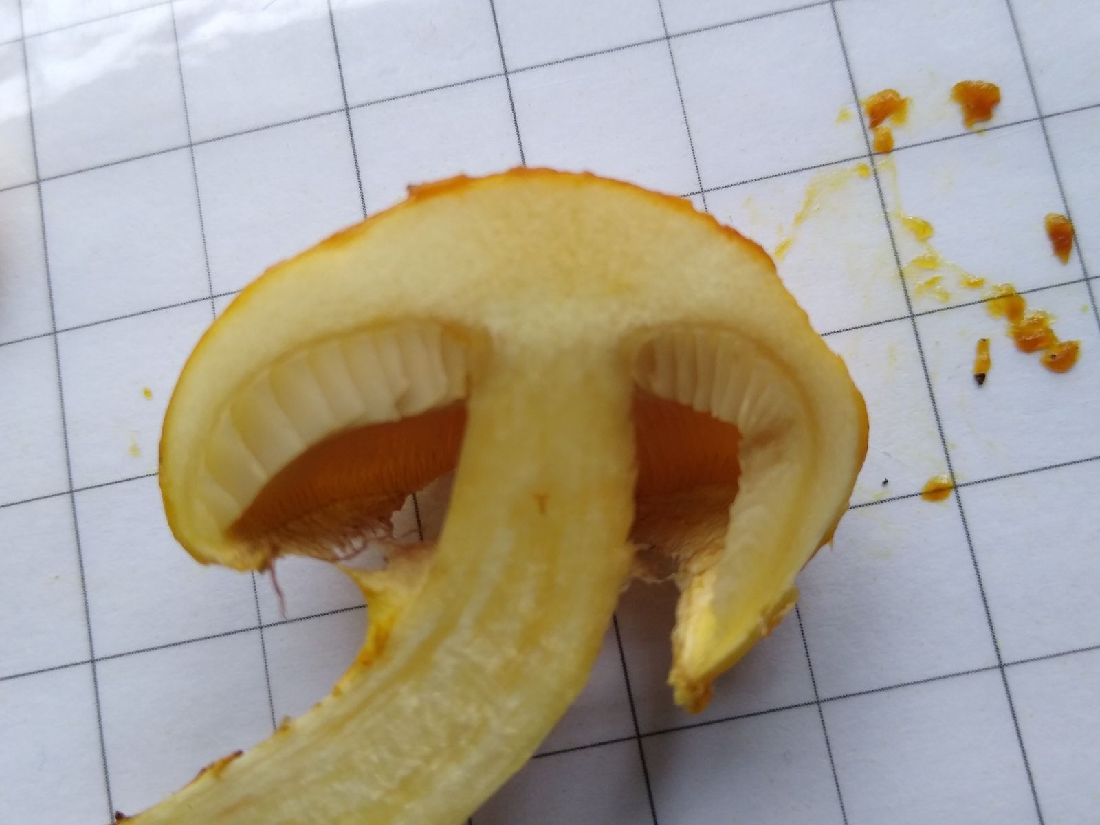 Der Pilz ist sonst leuchtend gelb an Huthaut und Stiel.
