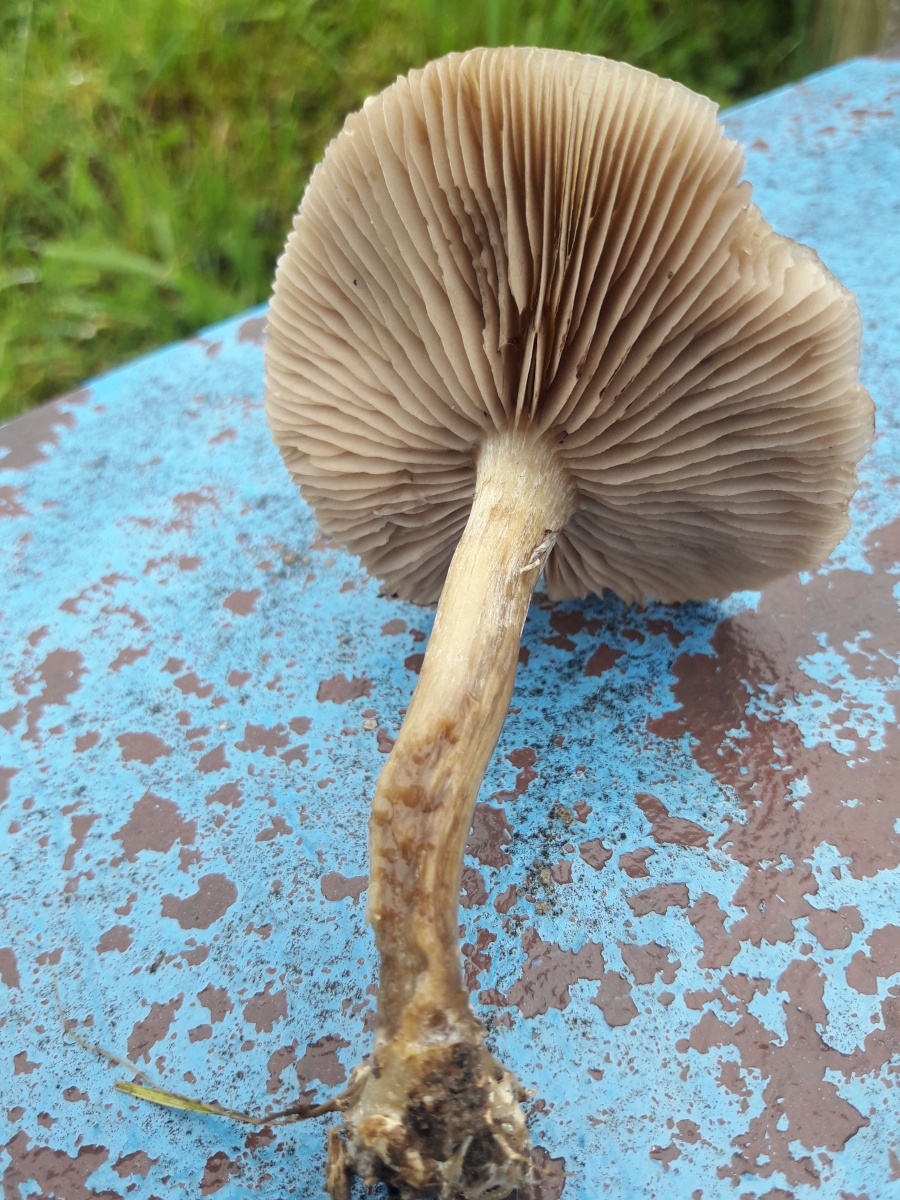 könnte ein Faserling sein. Der Hut war gelb-braun, die Lamellen schimmerten lila. Zuerst dachte ich an den behangenen Faserling, aber er hatte keine Velumreste am Hut, es hat zwar geregnet.........also vielleicht stimmt wenigstens Faserling....... ![]()
