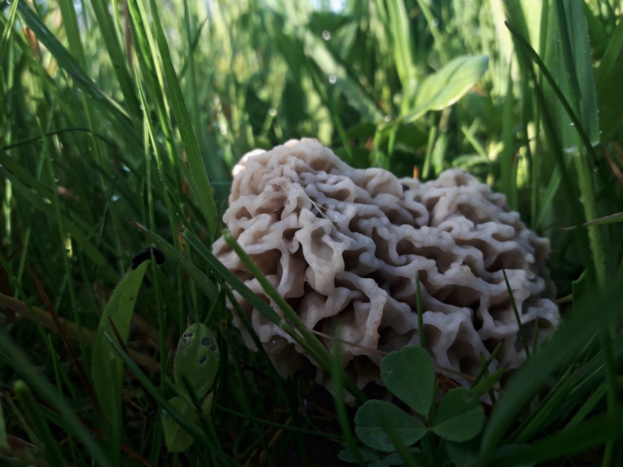 Nr. 5, Da fehlte der Chlorgeruch, sonst hätte ich gesagt, Morchelbecherling, wuchs auf dem Kalkboden neben den Morcheln.
