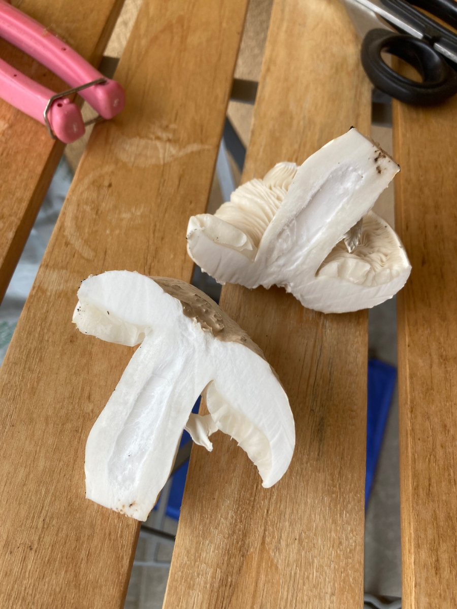 Am besten riechst Du auch einmal ganz unvoreingenommen erst am kompletten Fruchtkörper und dann auch an dem aufgeschnittenen.