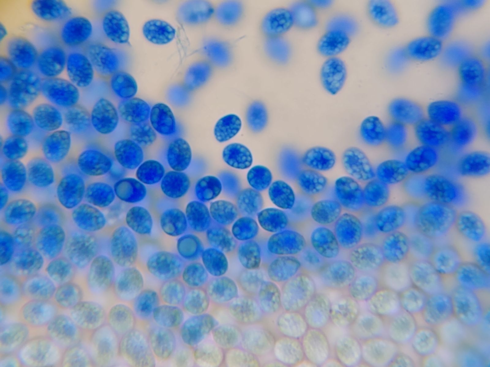 Bild 12 Sporen cyanophil mit vielen Tröpfchen gefüllt