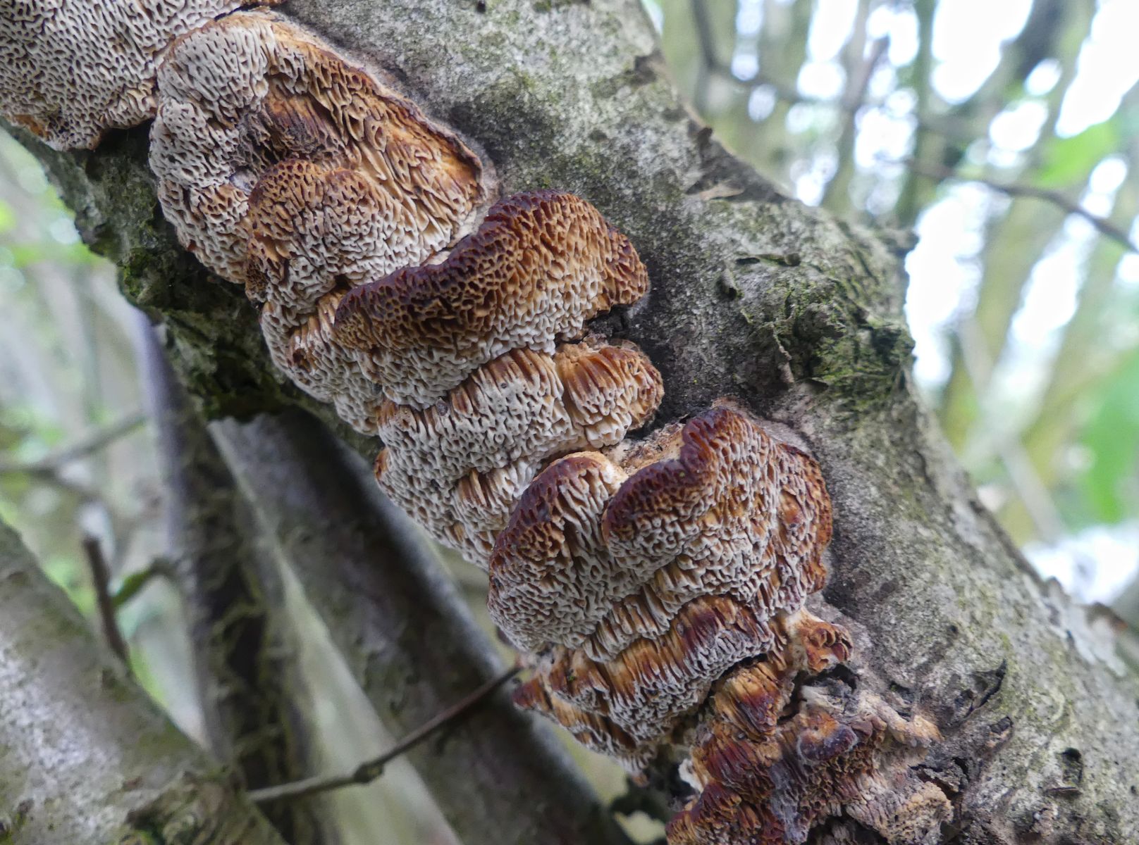 Ich halte das eher für den Erlen-Schillerporling (Inonotus radiatus). Der ein breiteres Wirtsspektrum hat, als der Name vermuten lässt und auch an Hasel vorkommen kann. Die Bilder der Ehinger Pilzflora passen doch wie die Faust aufs Auge!