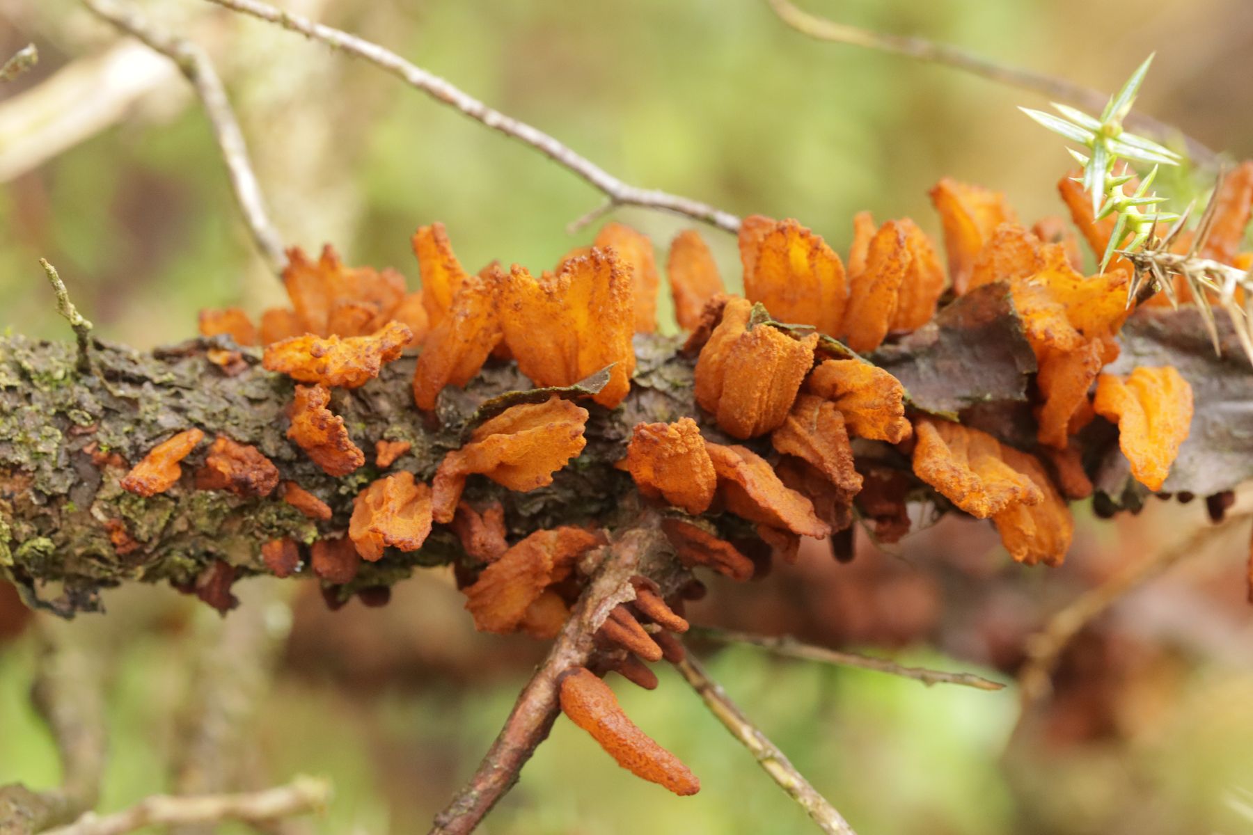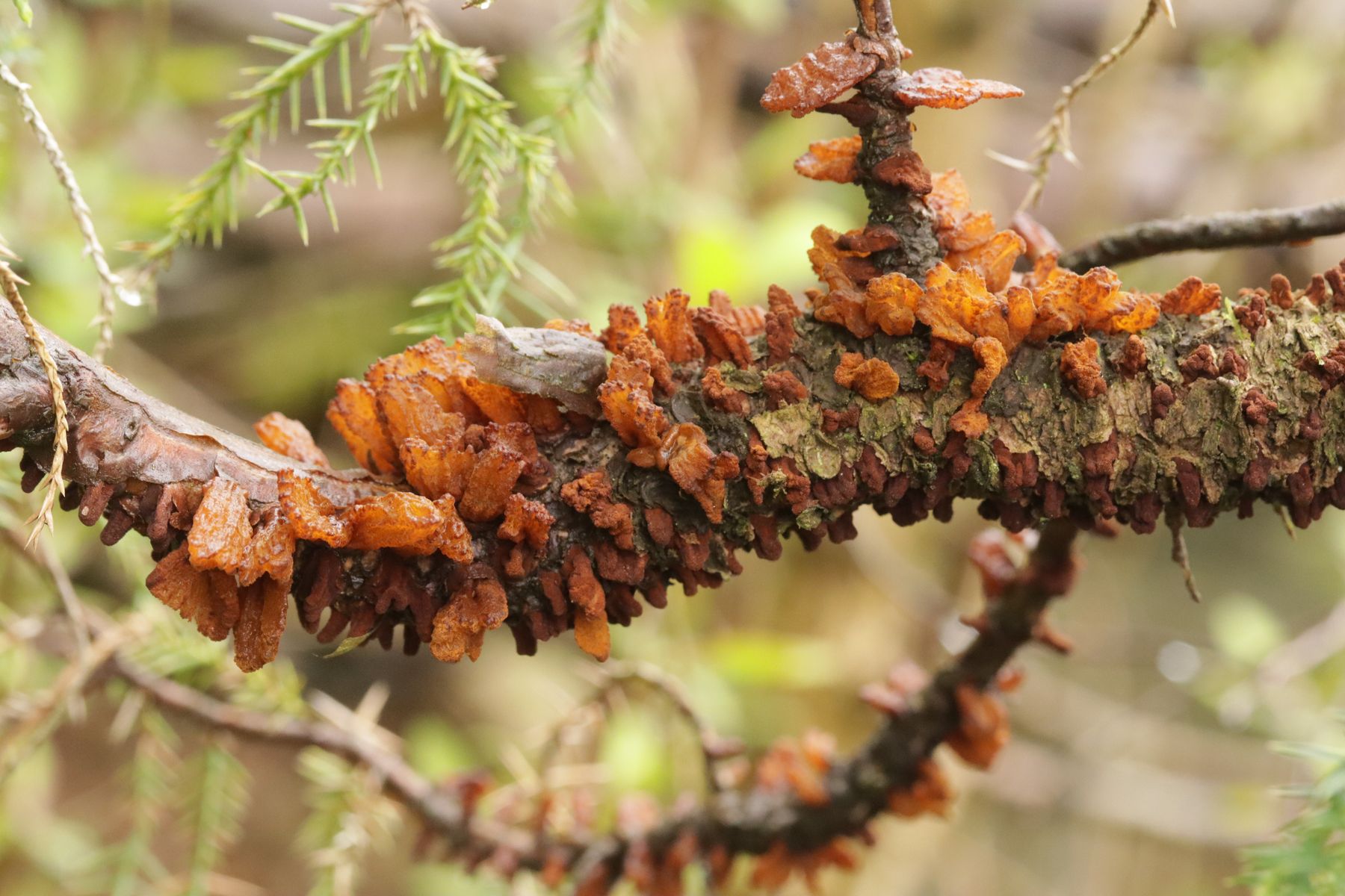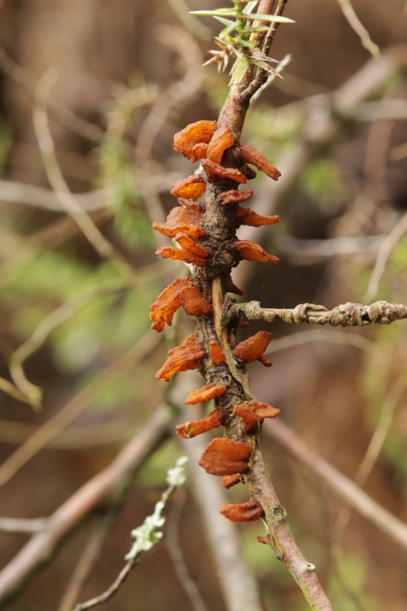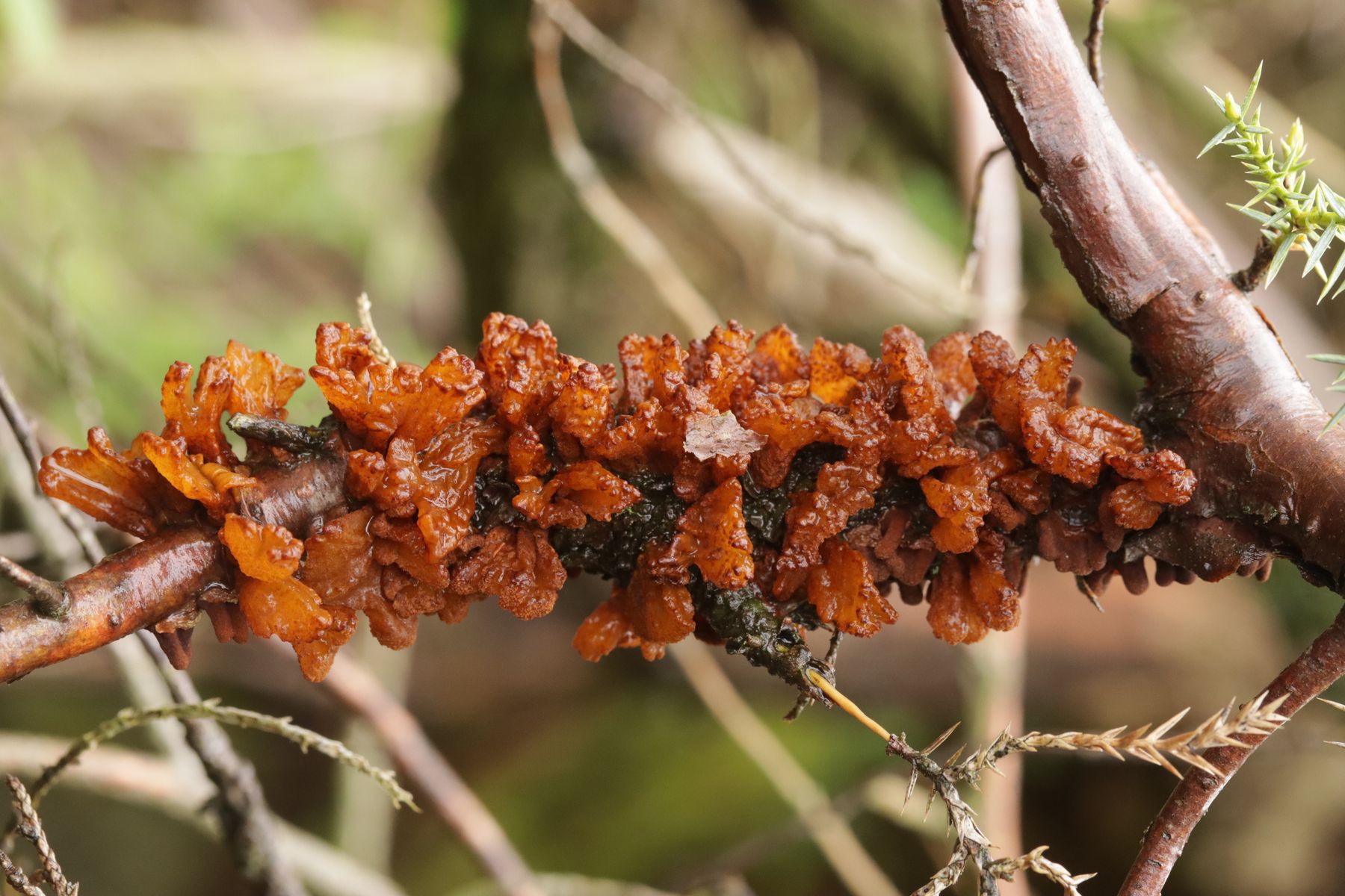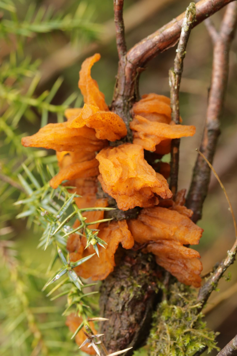 6. Am Haus dann noch wie im letzten Jahr Gymnosporangium sabinae ex Juniperus chinensis. Dank der feuchten Witterung in vollster Schönheit mit satt aufgequollenen Telien.