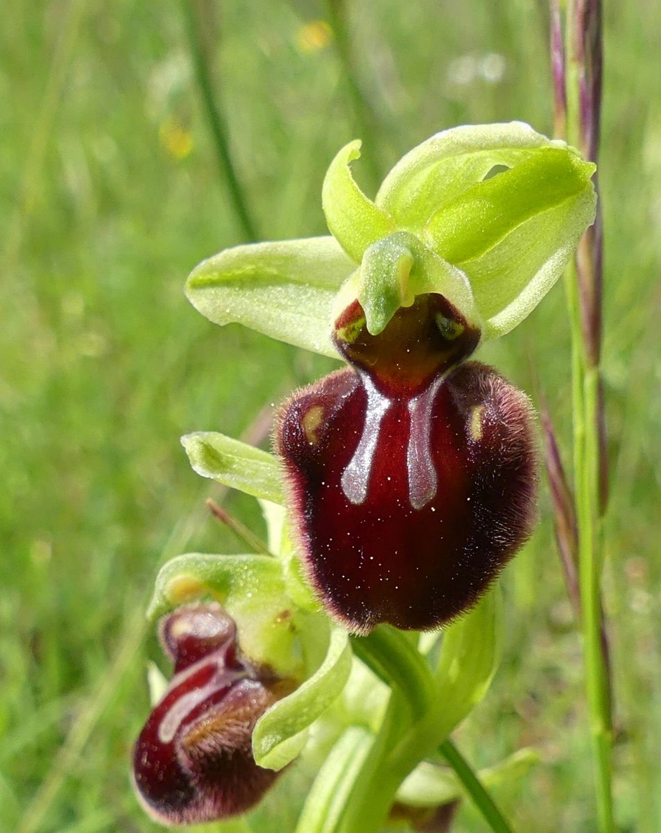 ... wohingegen die Fliegen-Ragwurz (Ophrys insectifera) im Gras schwer zu finden ist.
