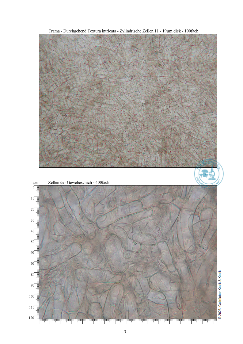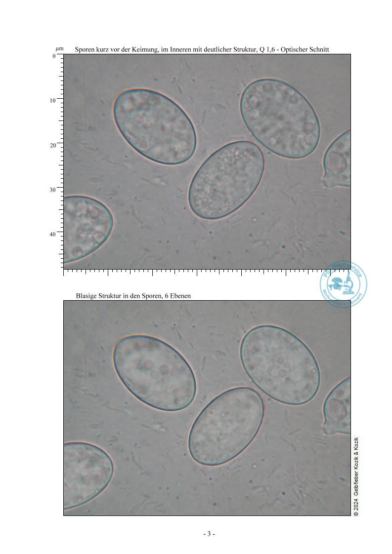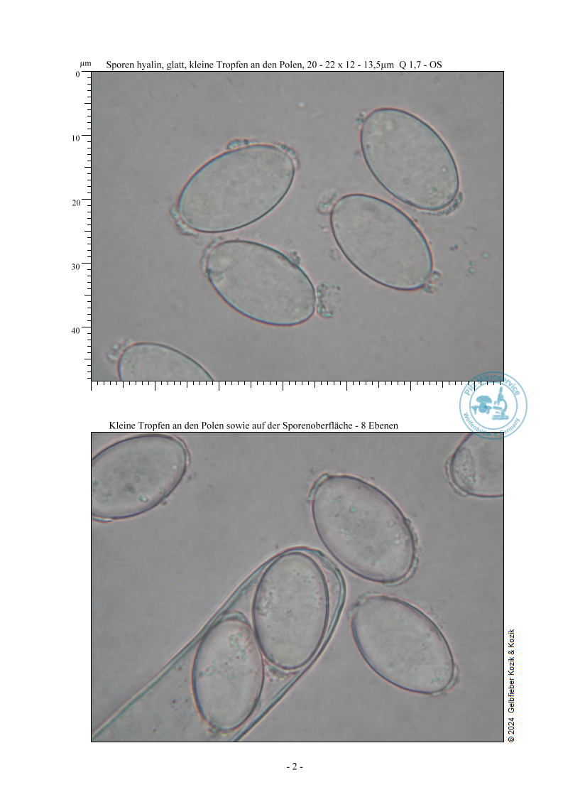 Mikroskopiert wurde Frischmaterial in Wasser. Diese Aufsammlung hat hyaline, breitelliptische, glatte Sporen. Die Sporen sind komplett mit kleinen Tropfen gefüllt und haben das Maß 20 – 22,5 x 12 – 15,5µm Q 1,6.