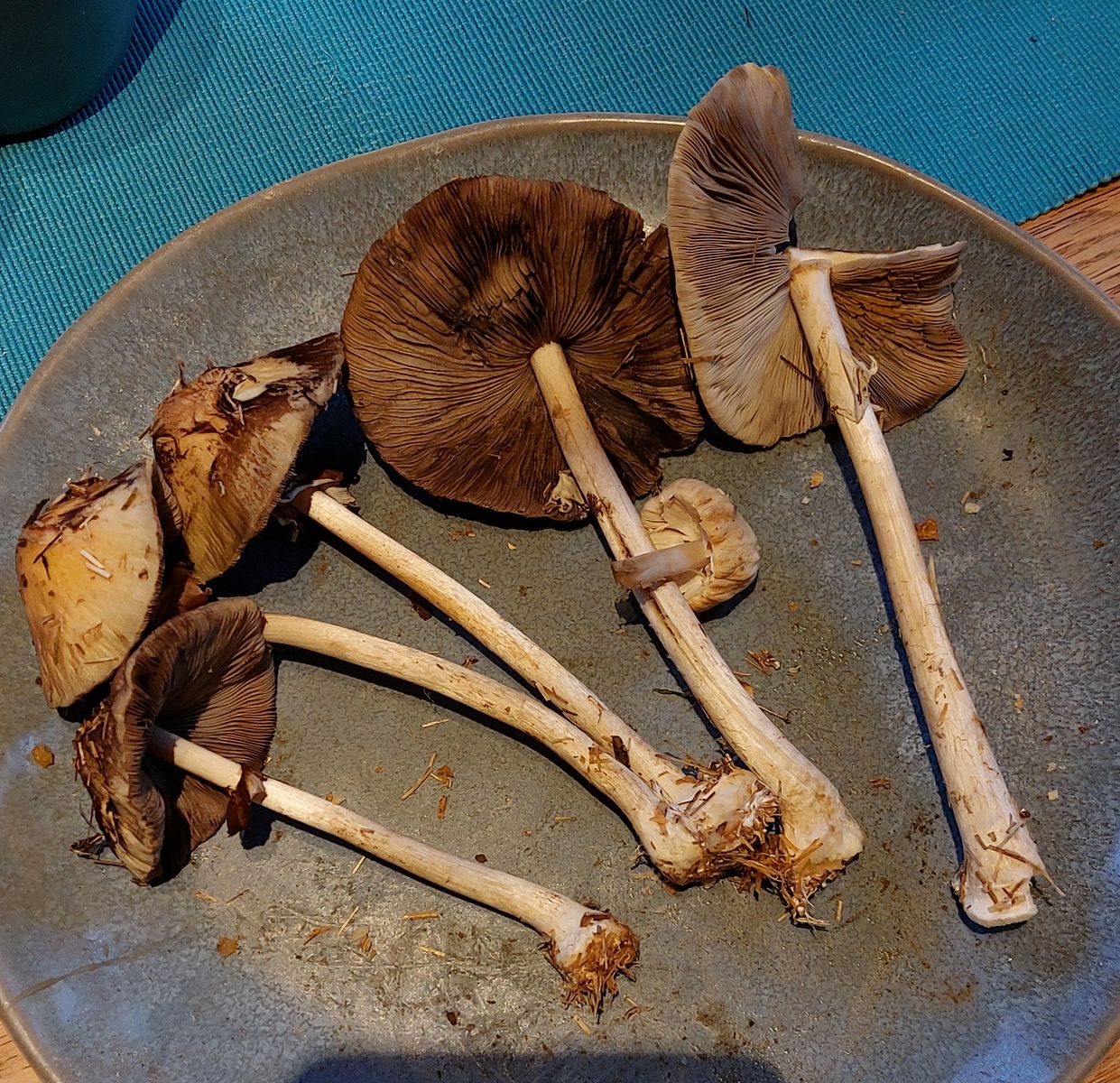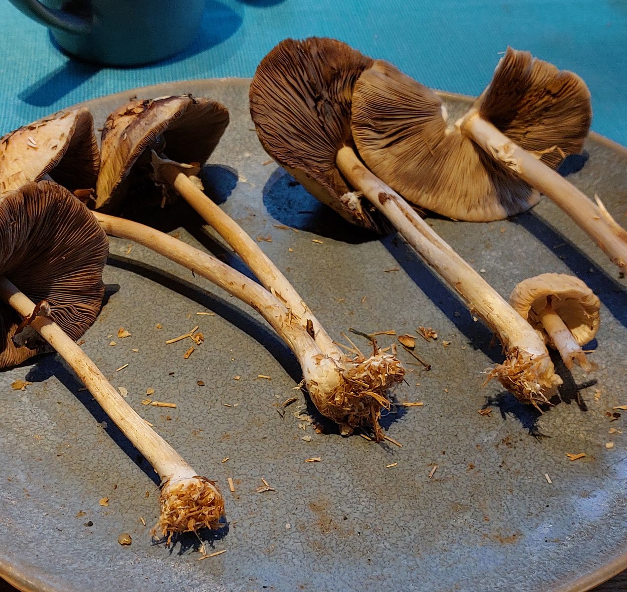 Volle Größe ca. 7cm; Sporenpulver rötlichbraun (rehbraun); Stiel weiß und innen hohl, unten leicht genattert; Hut braun und in Form beim jungen Pilz etwas an Glimmertintling erinnernd; Lamellen braun (und ohne erkennbare Druckverfärbung) erreichen den Stiel nicht ganz; weiße Manschette (auf den Fotos braun wohl vom Sporenpulver) erinnerte mich etwas an die Amanita-Manschette. Verdickung am Fuß aber ohne abgesetzten "Sockenrand" ... vgl. Fotos.
