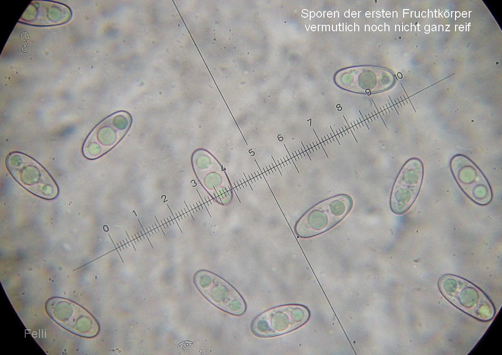Vermutlich sind die Pilzchen immer noch nicht vollreif, wobei ich den Eindruck habe, dass sich die Sporen nicht mehr sonderlich verändern werden da ja schon ein Abwurf möglich war.