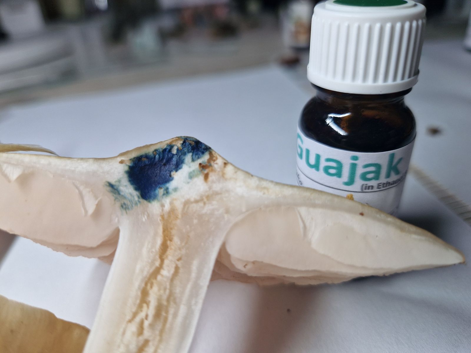 Es löst sich langsam in Isopropanol mit blassgelber Farbe. Eine Farbreaktion mit dem Rötling konnte ich allerdings nicht beobachten. Jetzt müsste ich wohl erstmal überprüfen, ob diese Testlösung überhaupt noch funktionsfähig ist, bevor ich falsche Schlüsse aus einer vermeintlich negativen Testreaktion ziehe.