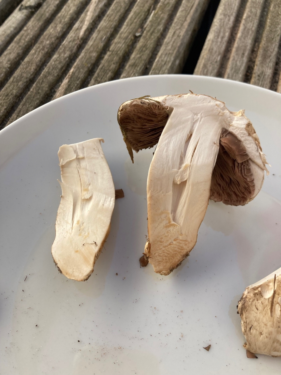 Ich weiß, Agaricus ist ohne Micro immer schwer. Aber ich tendiere mit einigen Zweifels zu A. Campestris. Ebenfalls im Rennen war aufgrund der Küstennähe auch A. fissuratus, aber da ist mir der Hut nicht dunkel und schuppig genug für, wenn Augustus hierfür der Benchmark ist.