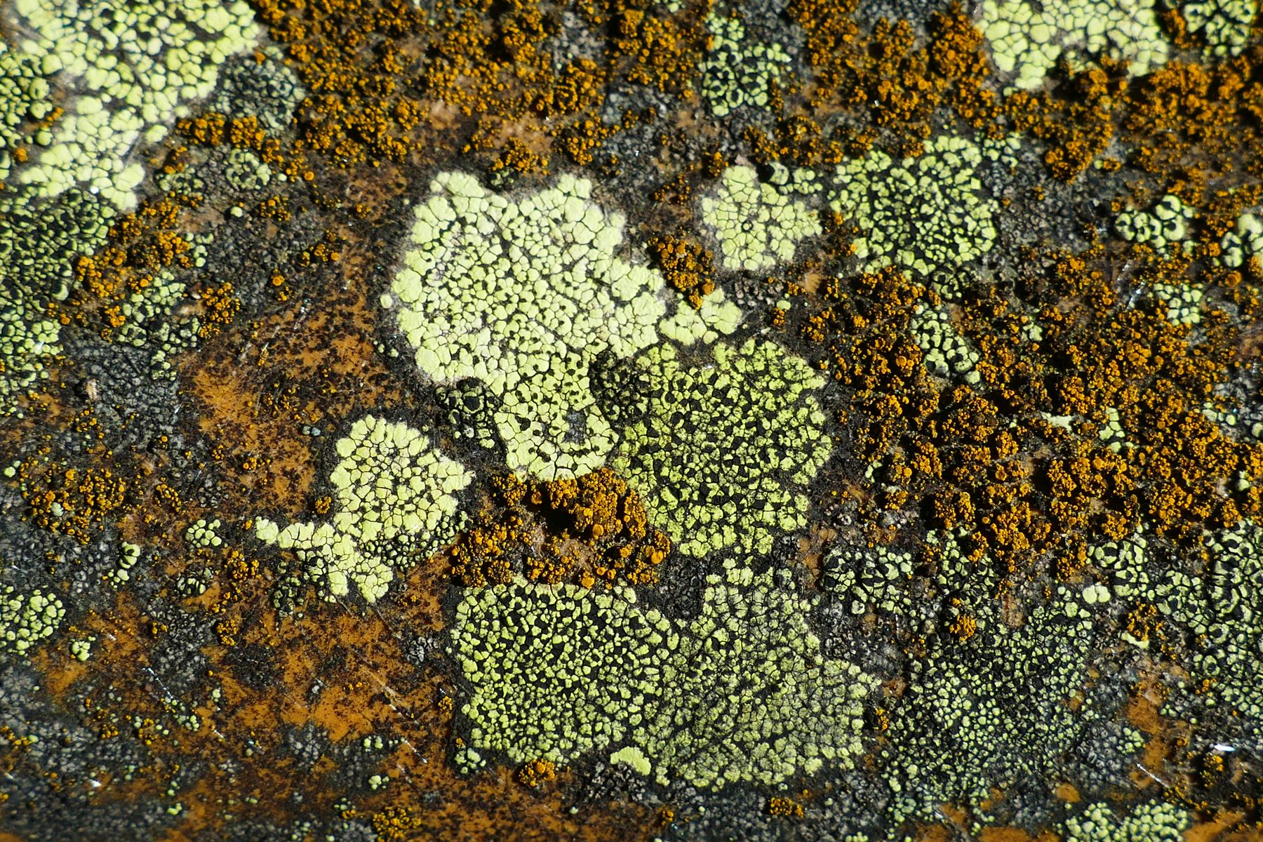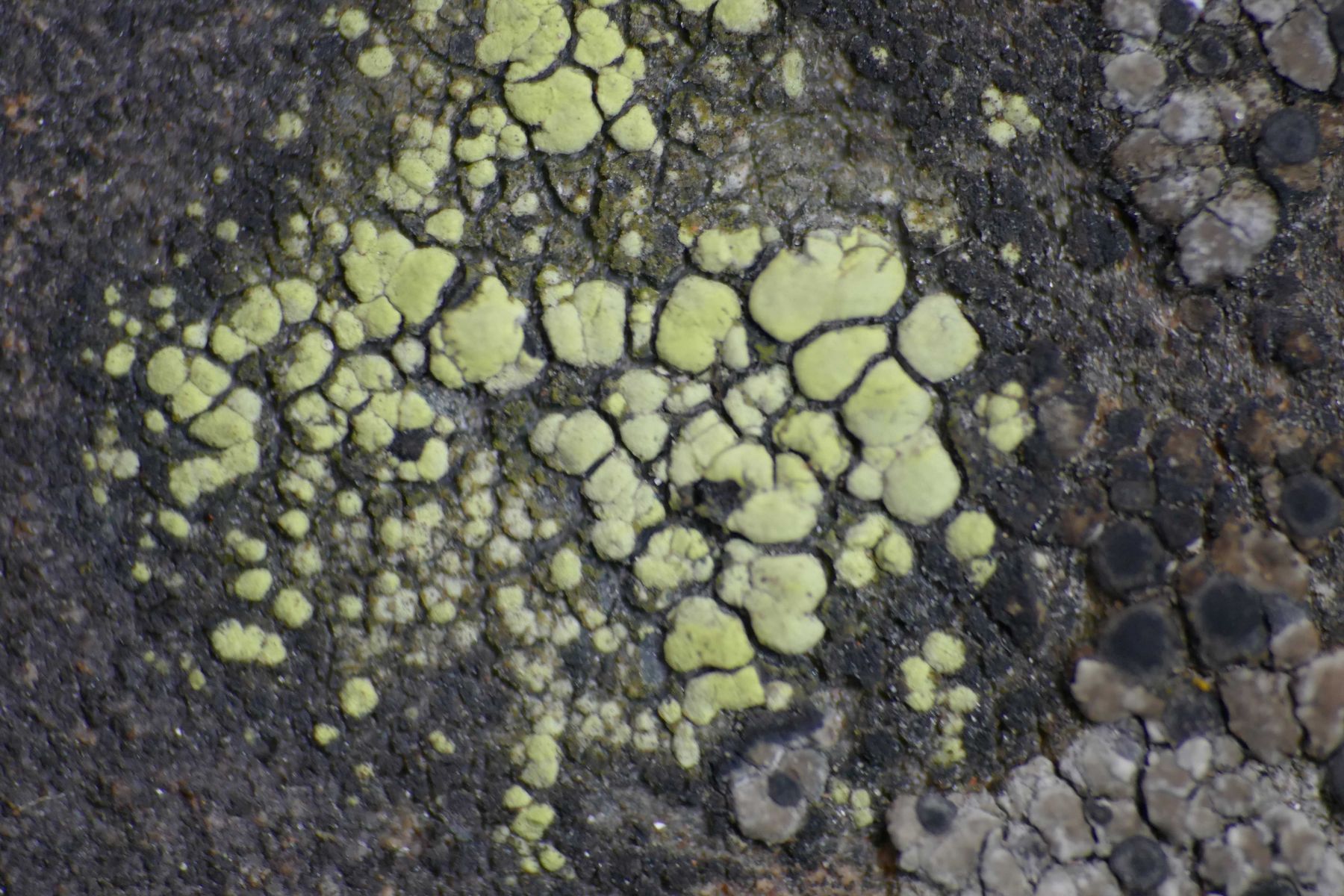 Die von dir vermutete Flechten-Artengruppe ist schwarz-gelb gescheckt mit eigentümlich grünlich-gelbem, eckig areoliertem Thallus.