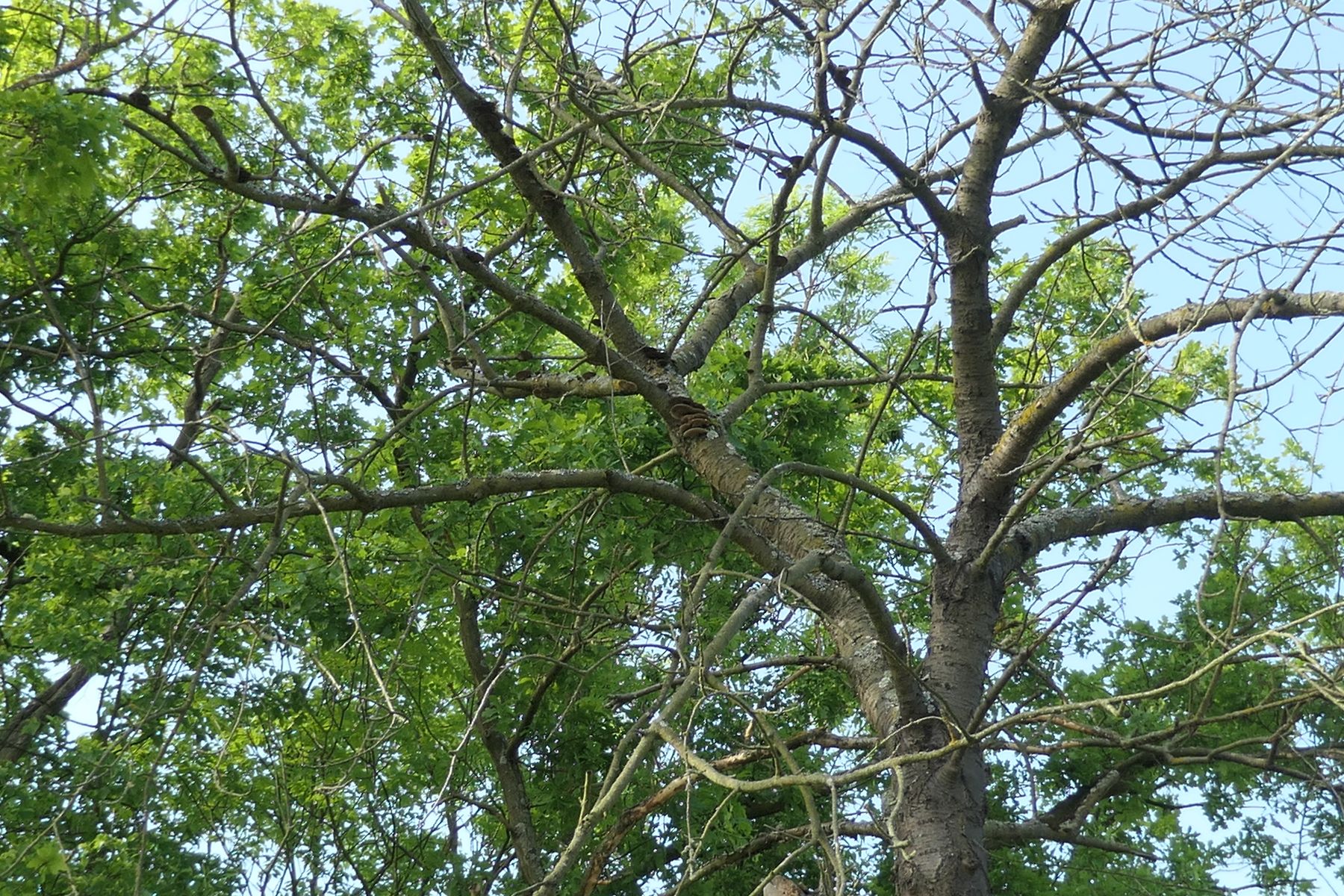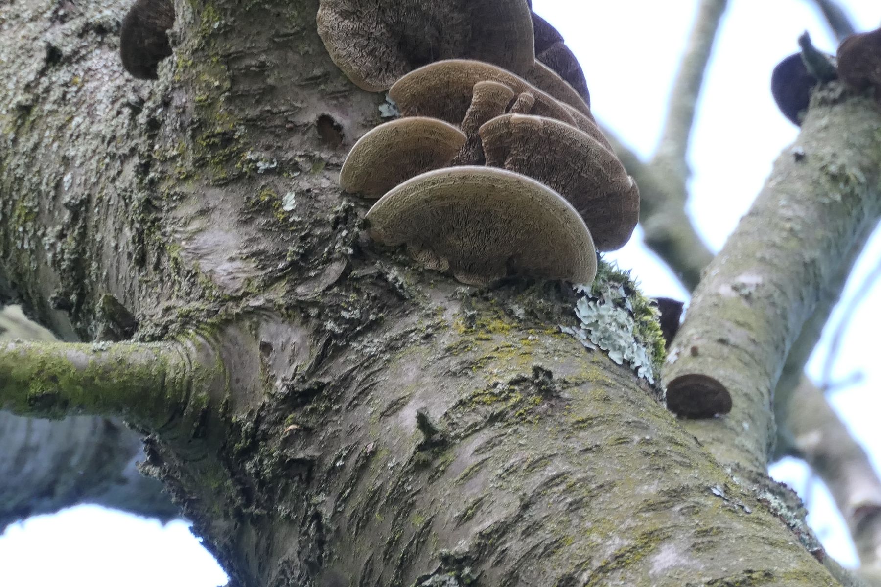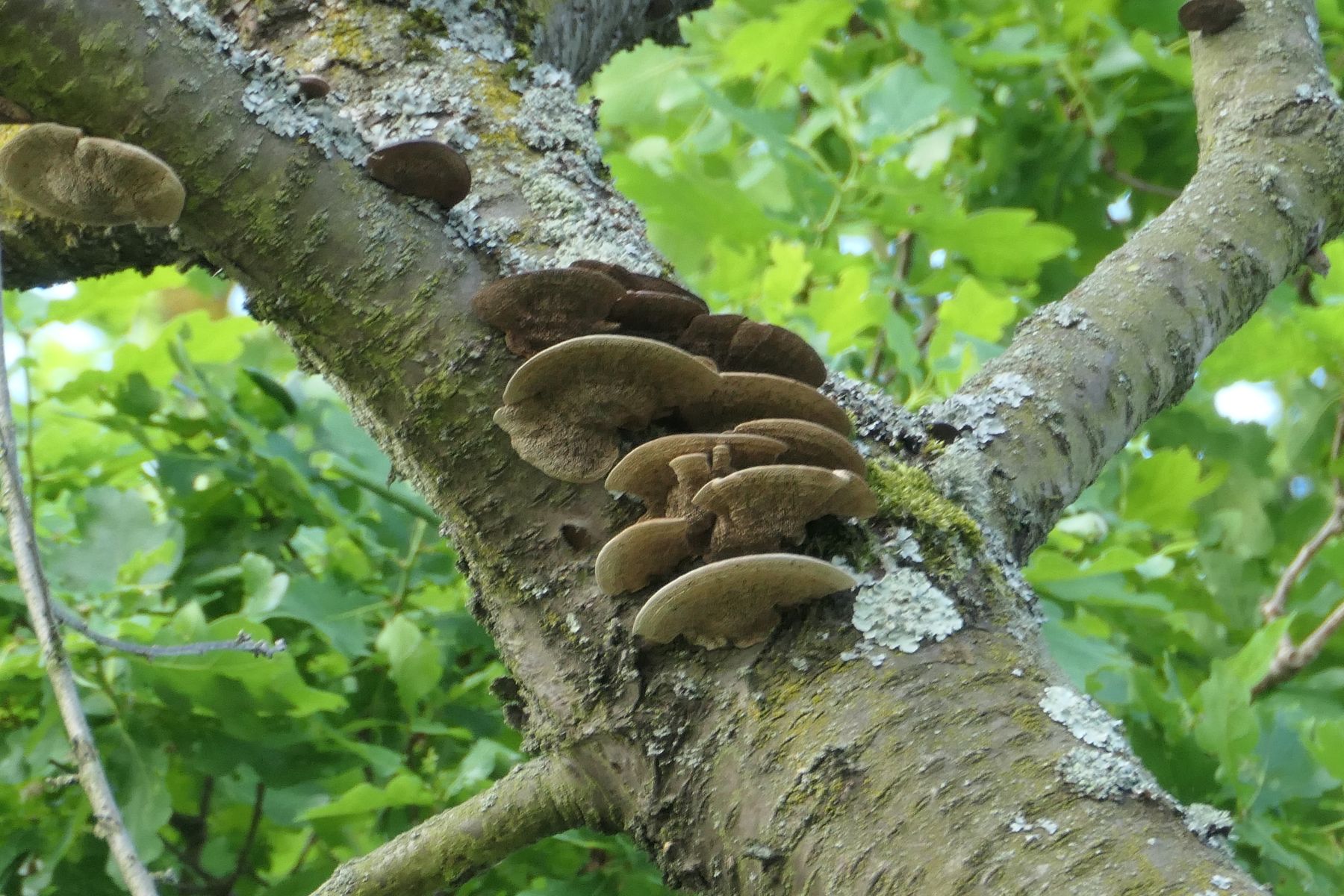 Moin, gestern ist mir aufgefallen, dass in einem Kirschbaum, da sind eine ganze Menge an abgestorbenen Kirschbäumen, ab einer Höhe von 5 m etwas wächst. Hier meine Bilder; sind das Trameten? Am Hauptstamm ist nichts zu sehen, nur oben in der Krone. Mehr Zoom kann meine Kamera nicht. VG Oskar