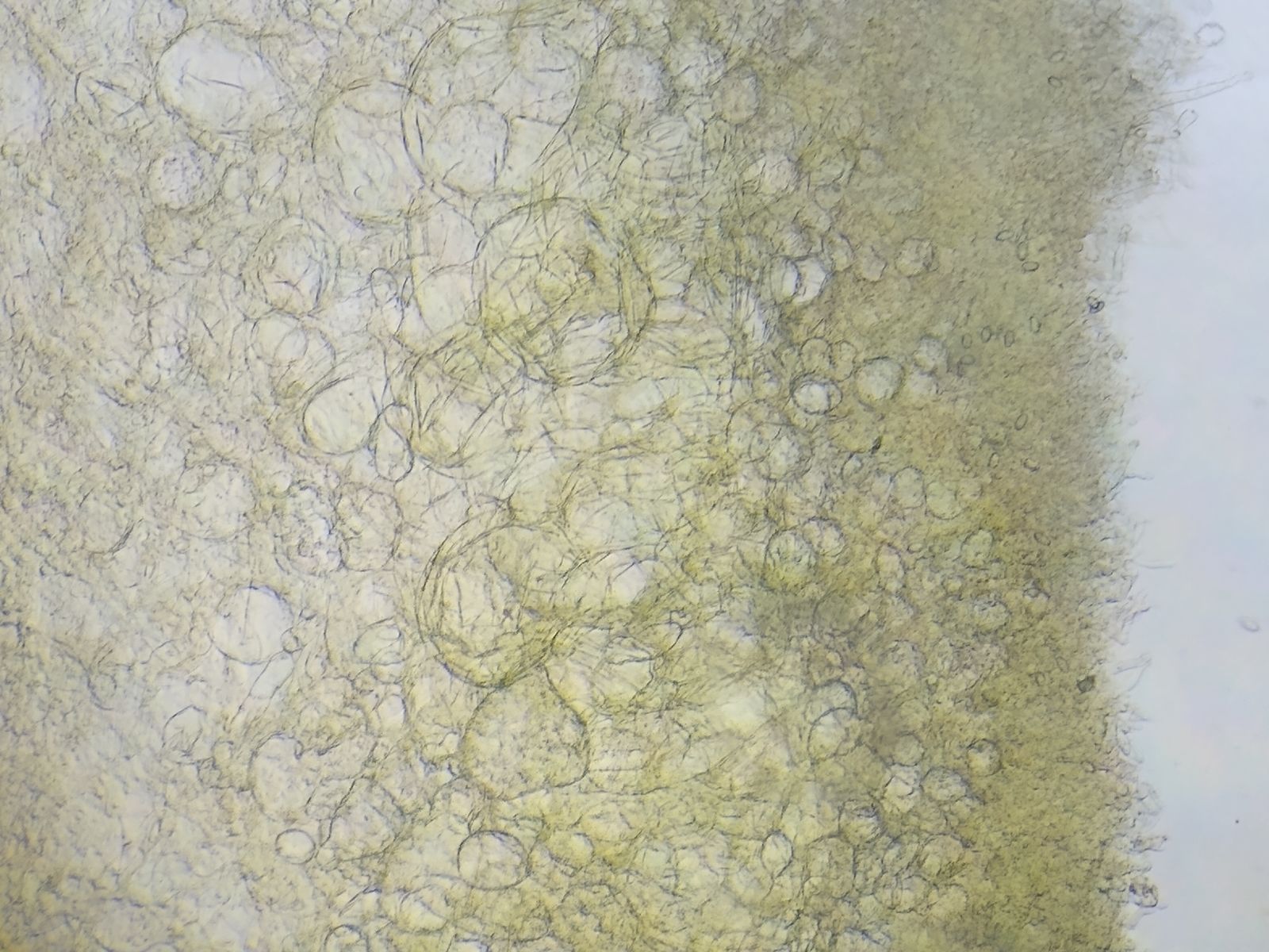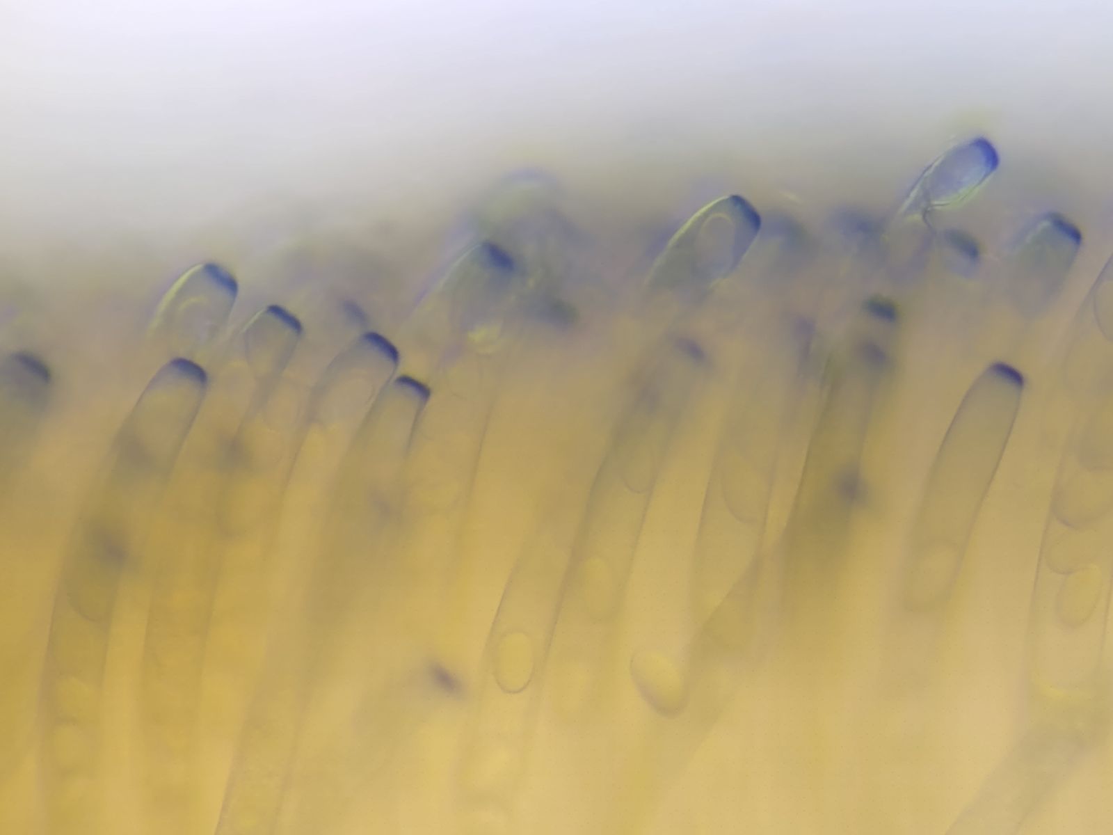 Bild 12 Hymenium und Medulla bei dem hellen Typ A, Asci um 250µm lang, blasige Zellen bis deutlich > 100µm