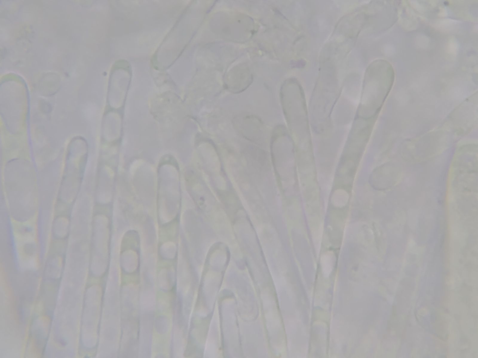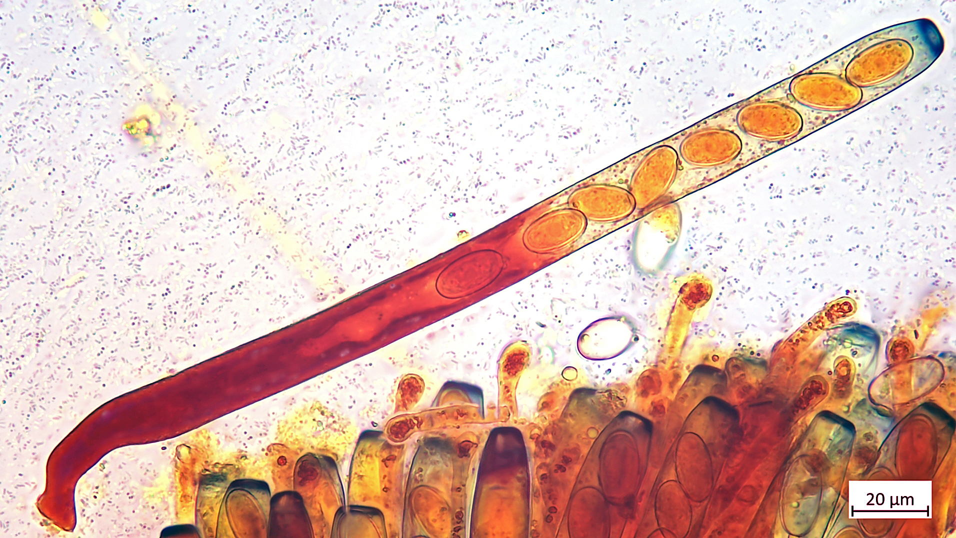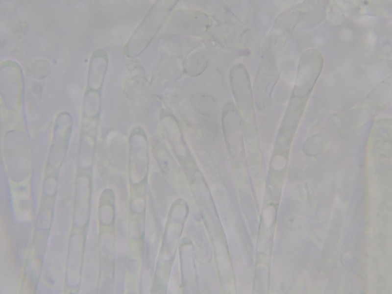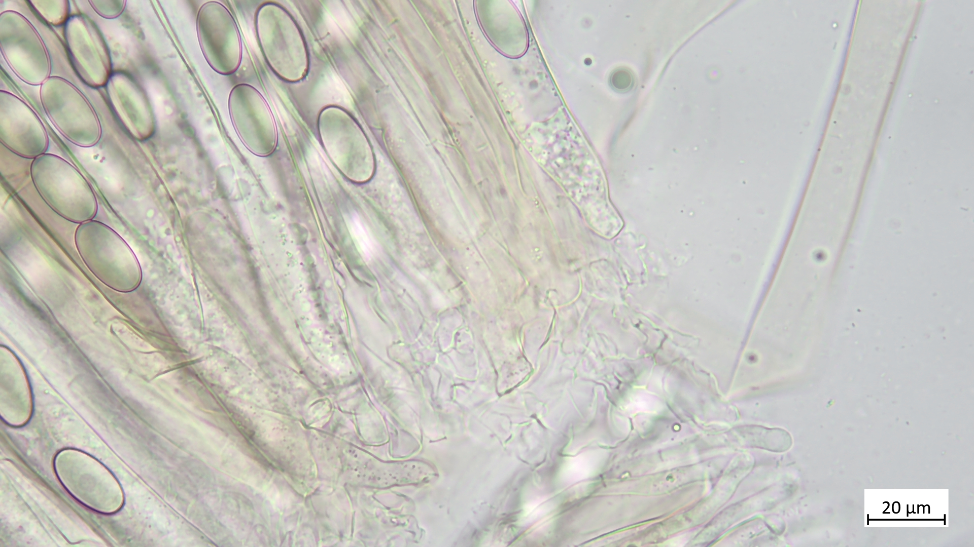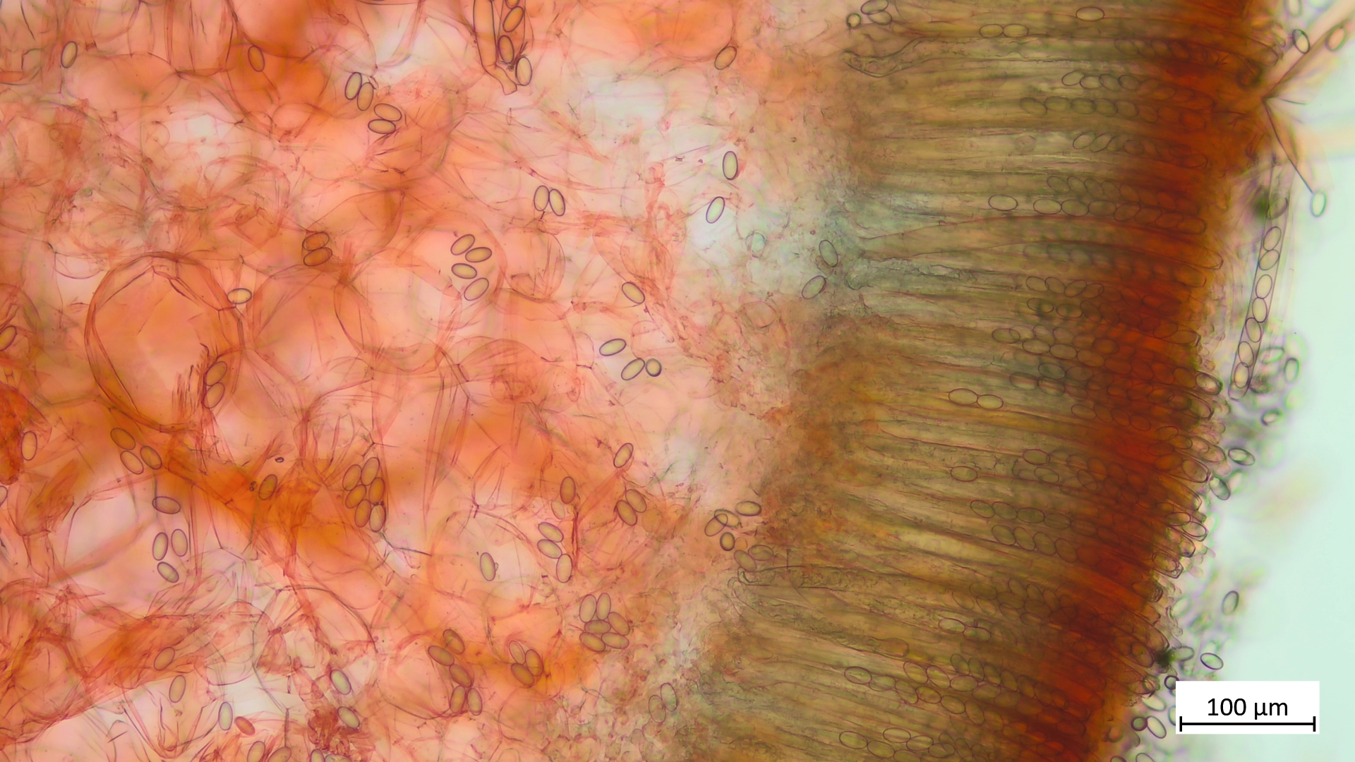 Der große, helle FK liefert kaum freie Sporen. Ich messe an den wenigen freuen Spiren 15-16 x 8-9 µm (verm. unreif). Keine Öltropfen.