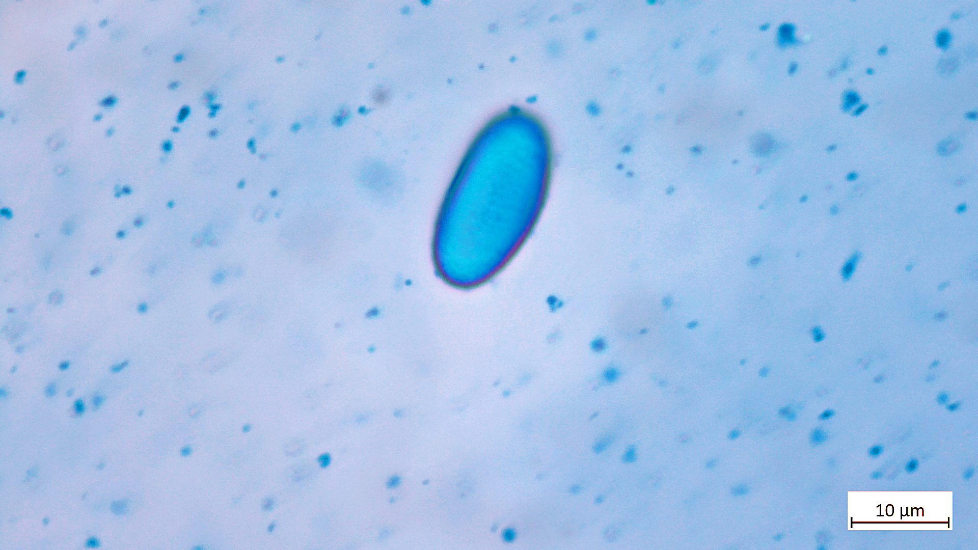 Bild 15 Unornamentierte, freie Spore mit 2 Tropfen (gefunden bei braunem Typ B), in BWB gefärbt