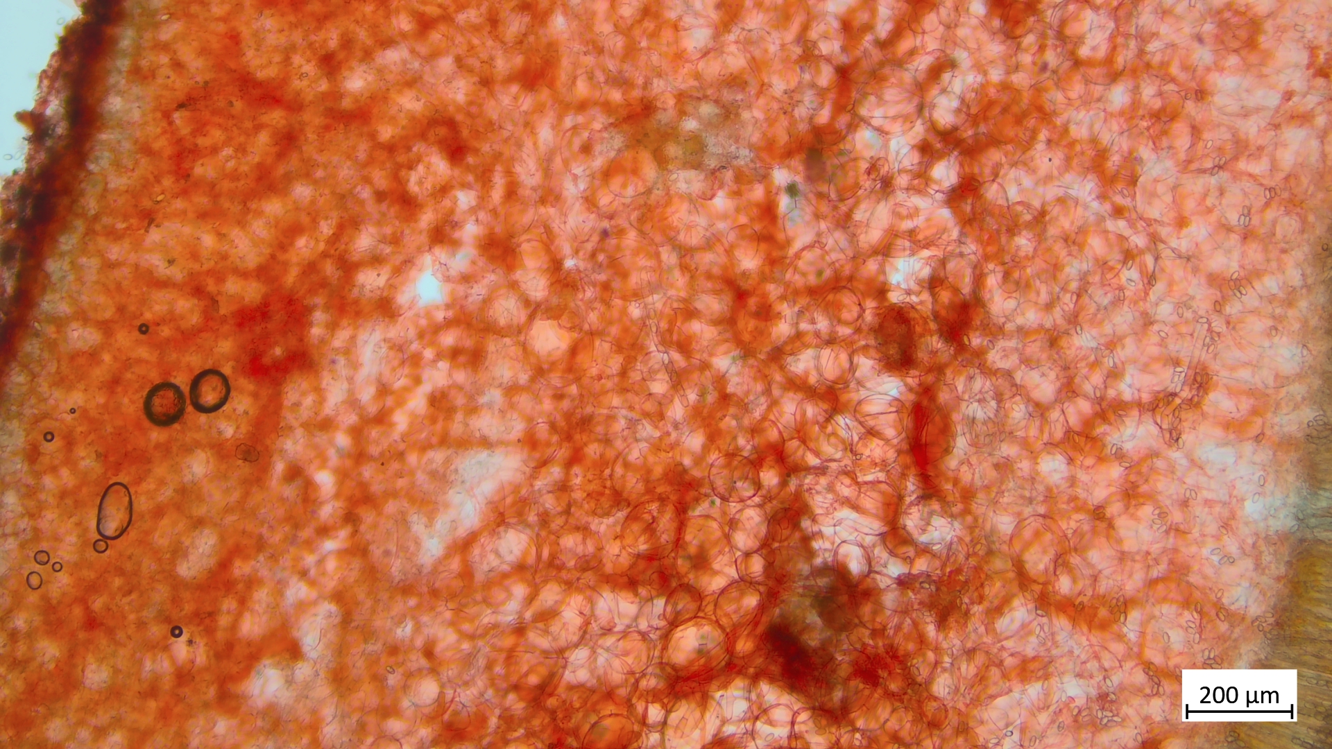 Unterhalb der Medulla soll man auf eine Textura intricata prüfen, parallel zum Hymenium ausgerichtete Hyphen - solche Hyphen kann ich in beiden Fällen nicht finden.