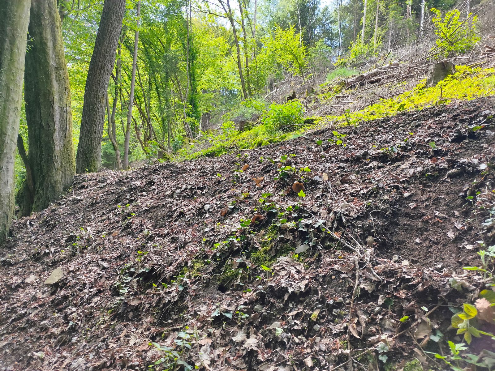 Der Baumbestand am Bachlauf ausschliesslich Rotbuche/Hainbuche oberhalb des Weges waren mal Fichten (siehe Bild).