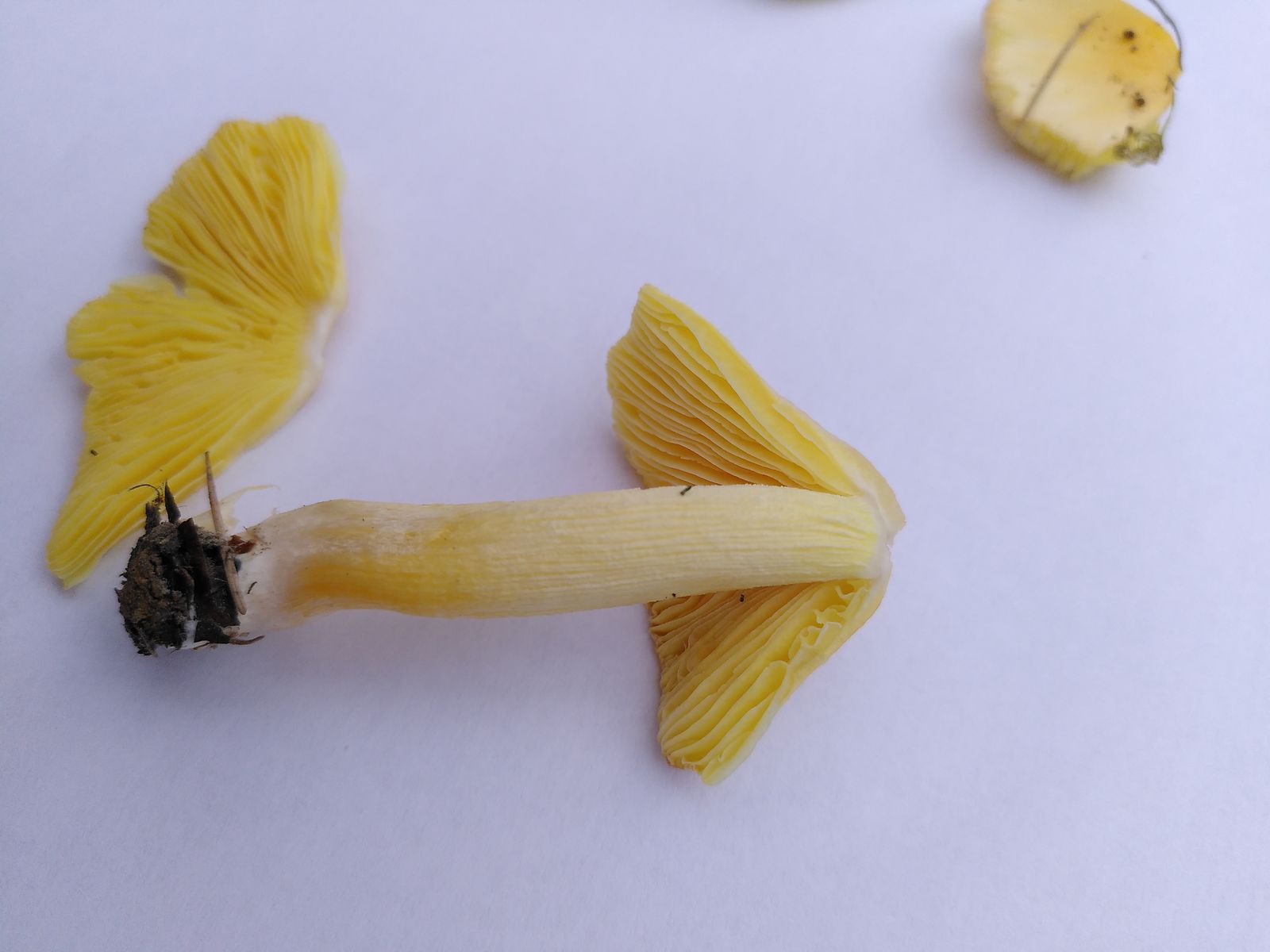 Lamellen: Gelb, frei bis evtl. einen Hauch angeheftet, im Alter braun, daher vmtl. braunes Sporenpulver