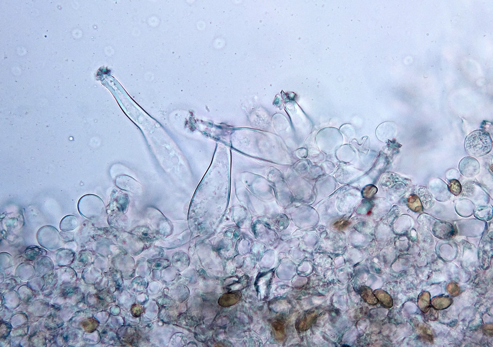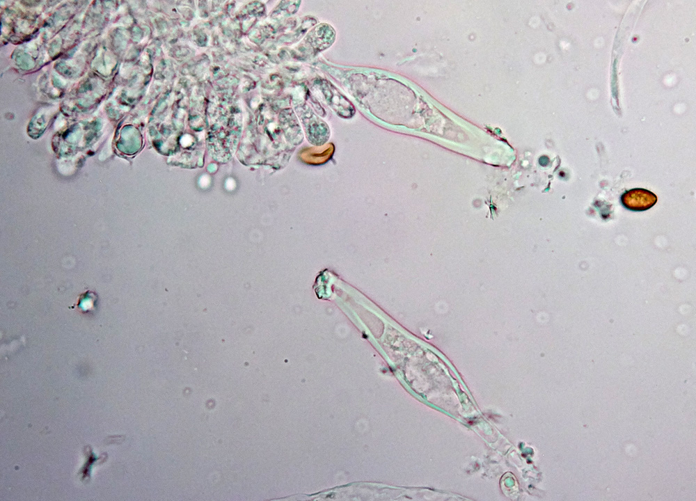 Caulozystiden: reichlich, auf ganzer Länge, z.B. 60 – 70 x 20 – 35, auch bauchig, un