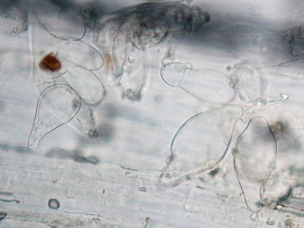 die Hüte waren auch bei einem weiteren Exemplar sehr zerschlissen und mittig schuppig, was nicht für I.subbrunnea et al. spricht. Kristallbesatz habe ich auch nach Durchsicht meiner anderen Mikroaufnahmen nicht feststellen können, nur natürlich Kristalle am Schopf. Die fehlende gelbe KOH-Reaktion der Zystiden ist ja das Problem, sonst wäre die Spur zum Kreis der Verdächtigen deutlich einfacher.