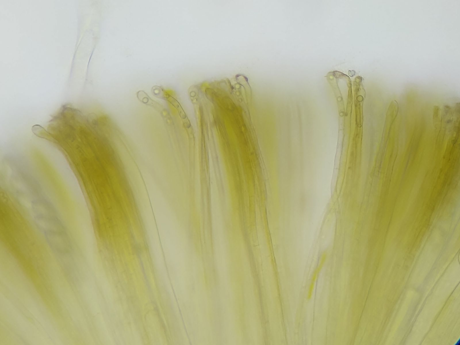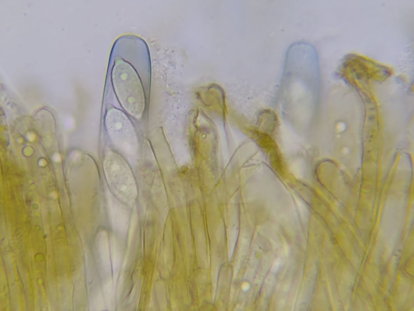 Bild 9 Paraphysen schwach kopfig, leicht gebogen, gelblich gefüllt, Tröpchen enthaltend (Wasser 400x)