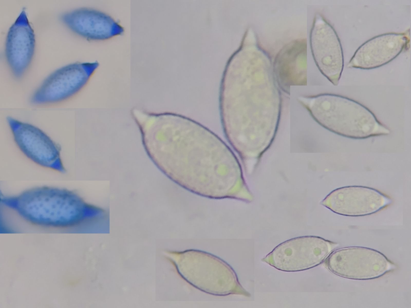 Bild 14 Sporen mit 2 Tröpfchen inamyloid, deutlich warzig ornamentiert (links in BWB), mit cyanophilen Anhängeln