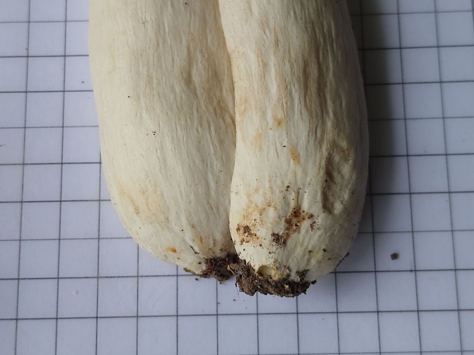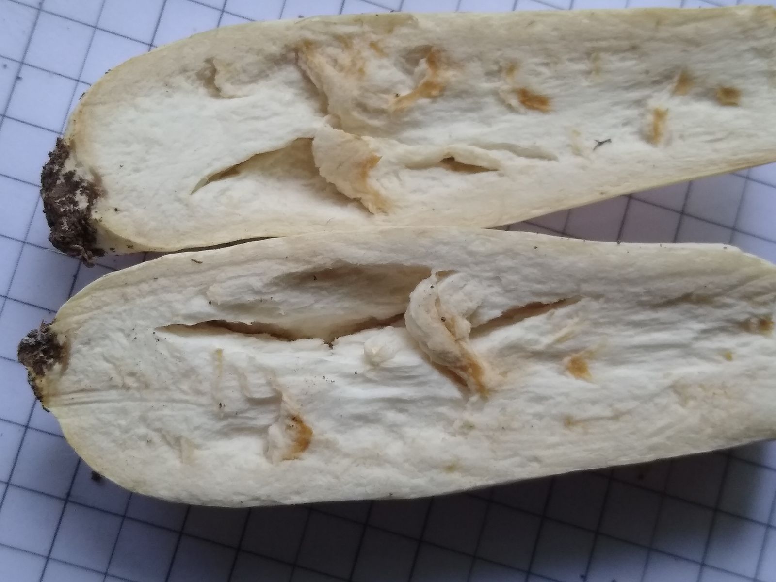 Bild 4 Fruchtkörper zerlegt - frisch noch ohne Verfärbungen / Keine Lameletten oder Anastomosen. Hut dünnfleischig, sehr brüchig