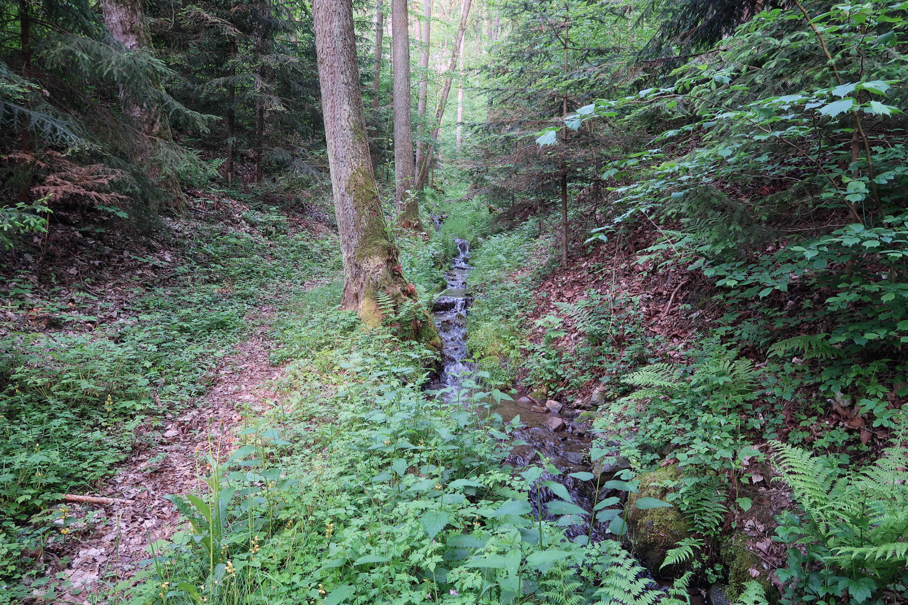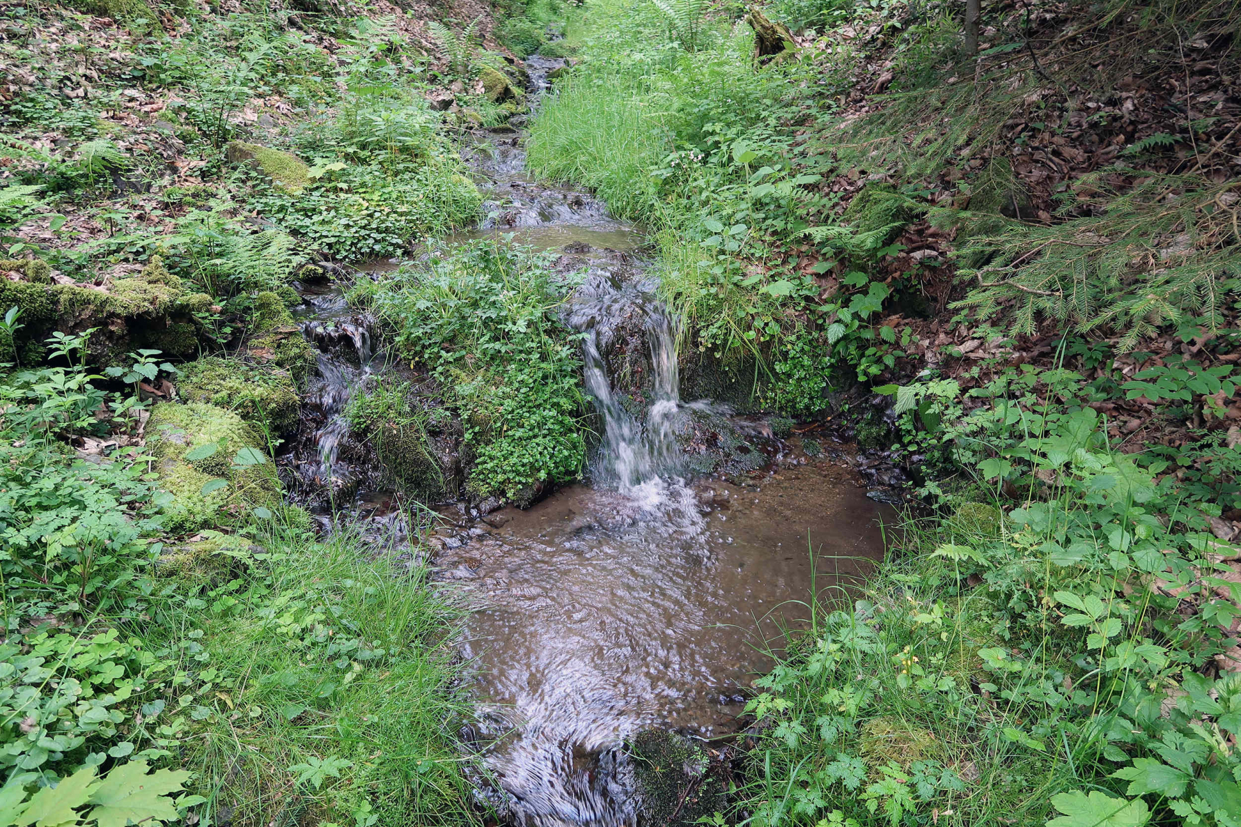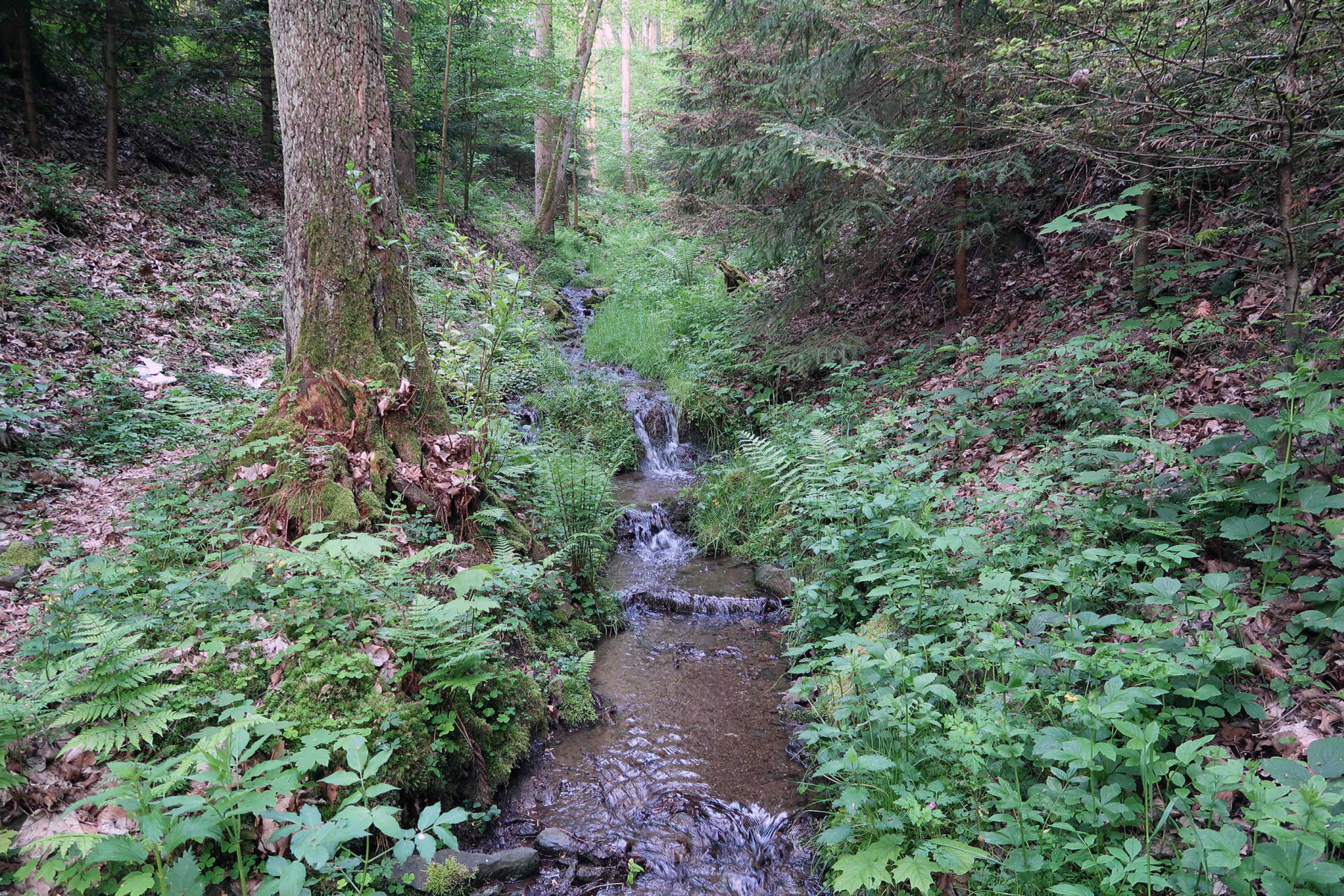 Start war an einem Bachlauf, welcher an einem Hang aus dem Wald kommt. Ganz klares Wasser, Absätze, Steine, Totholz. Das bleibt alles im Wildwuchs erhalten, da wird nichts dran gemacht.Weiter Bachaufwärts sind kleine Teiche zur Jungfischanzucht vorhanden.