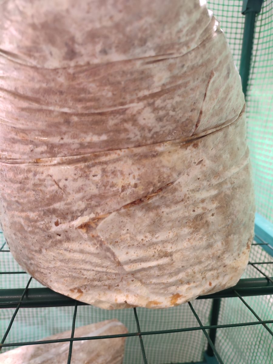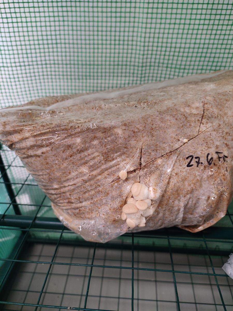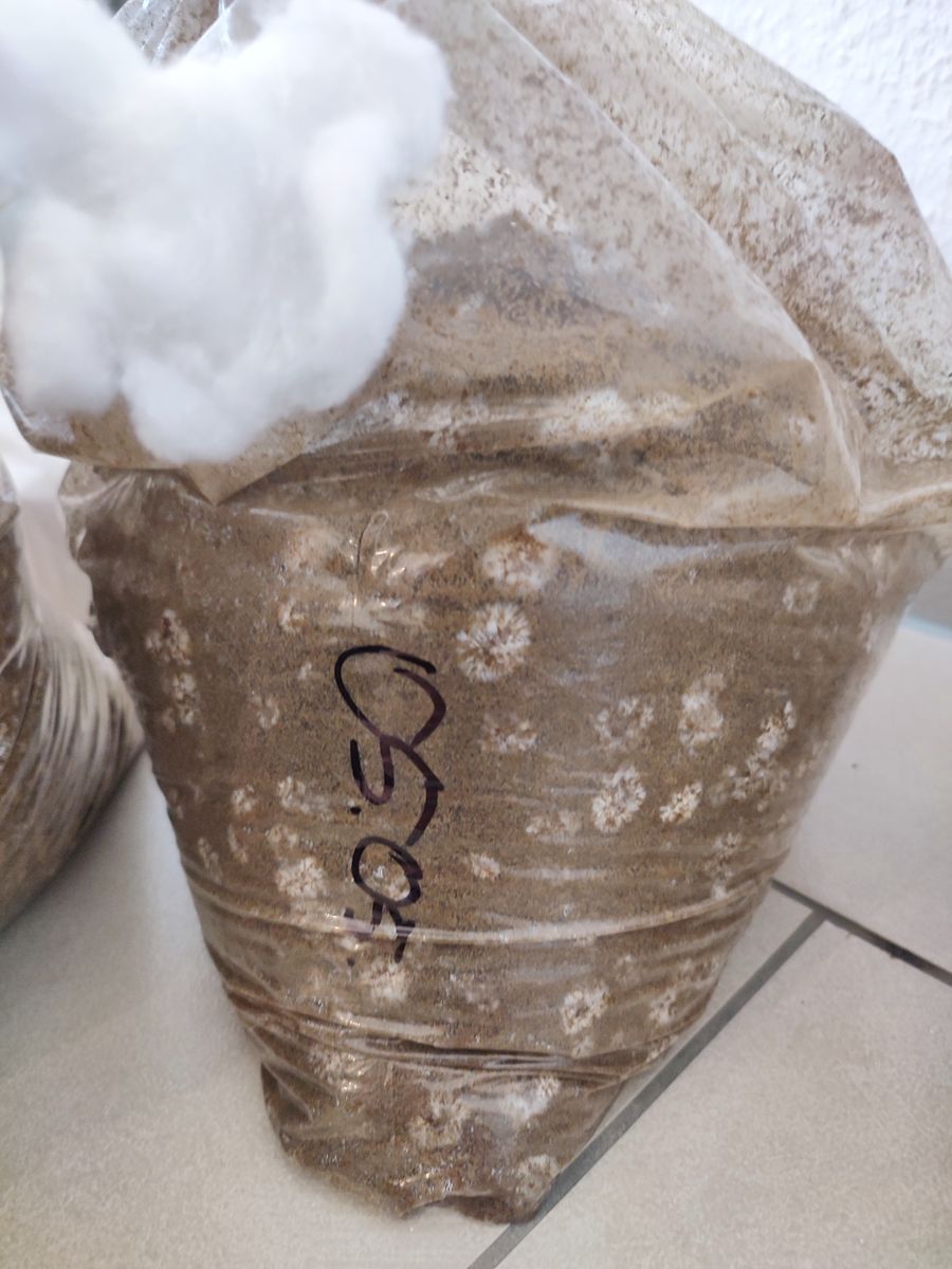 Nebenbei habe ich noch zwei mal 1 kg Hartholzpellets mit 1% Wasserstoffperoxidlösung rehydriert (bewusst viel zu starke Lösung verwendet, normalerweise sollte es 0,5% sein) und mit völlig überlagerter Piopinobrut beimpft. Das selbe mit völlig überlagerter Maitakekultur. Mal gucken was da passiert, die Brut zeigte schnelels Mycelwachstum, das Mycel scheint aber relativ langsam in das Substart rein zu wachsen, wahrscheinlich wegen dem hohen Anteil von Wasserstoffperoxid. Mit der Zeit verfliegt das allerdings und dann sollte das Mycel auch rein wachsen. Spannend zu sehen, ob es Kontis geben wird, oder nicht.
